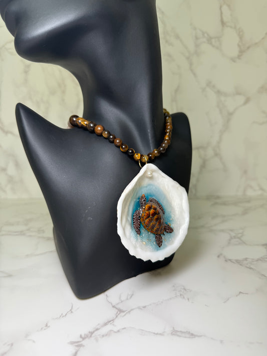 Dark Brown Sea Turtle Resin‑Encased Sea Turtle in Shell with UV Resin on Crystal Bead Necklace