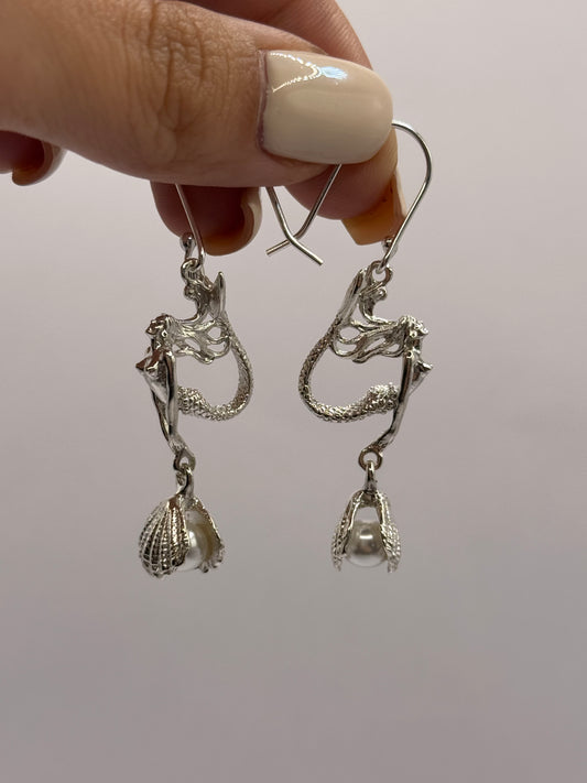 Mermaid Dangle Earrings with Pearl in the Shell for Women, Handcrafted in 925 Sterling Silver, Made in USA