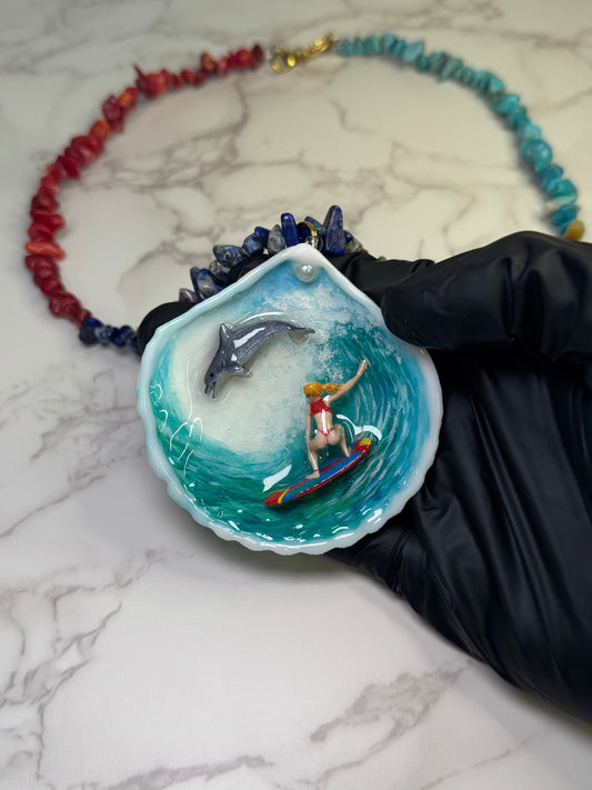 The Surfer and The Dolphin Shell Necklace - Encapsulated in Real Shell with UV Resin