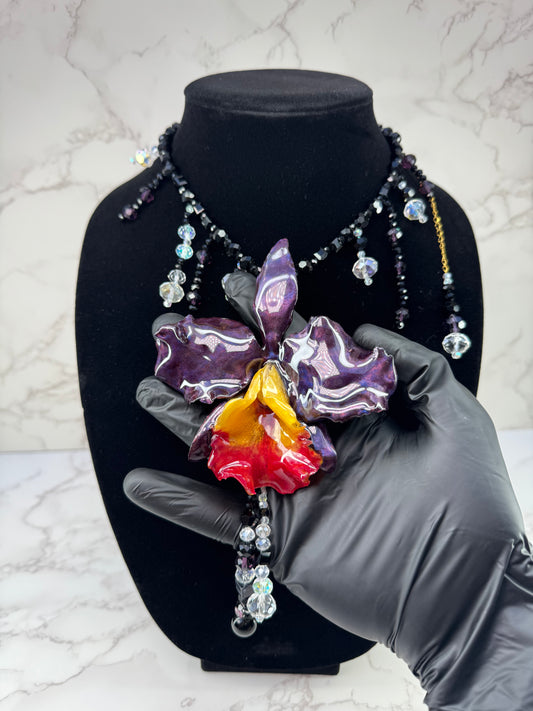 Aurora Carnival Cattleya Golden Cattleya Orchid Necklace – Purple Iridescent Petals & Multicolor Crystal & Gemstone Beads