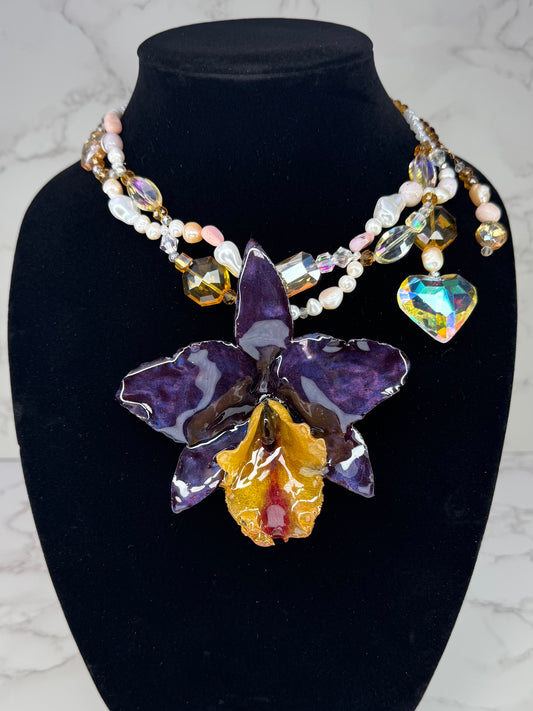 Midnight Aurora Cattleya Golden Cattleya Orchid Necklace – Freshwater Pearls, Crystal Beads & Clear Crystal Heart Pendant