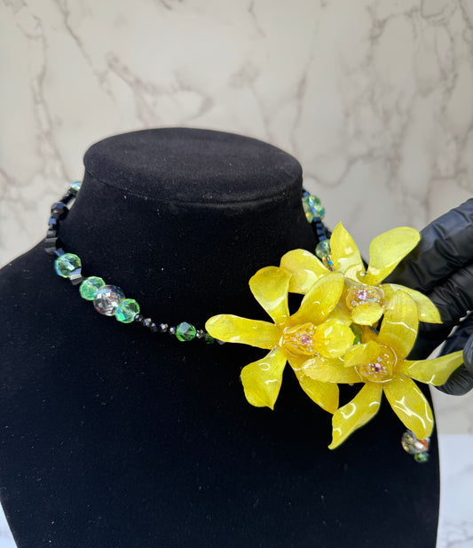Crimson Spotted Golden Cattleya Mini Yellow Cattleya Orchid Necklace – Long Black Crystal Double Wrap Necklace