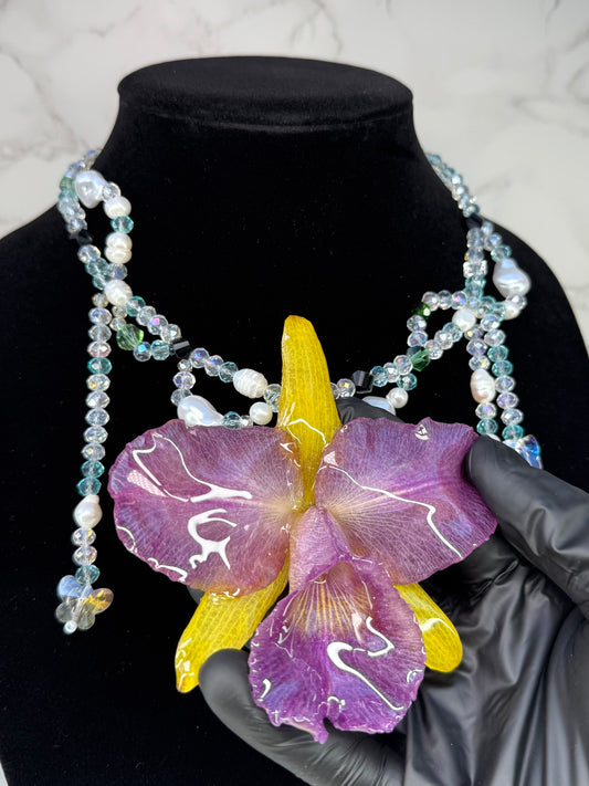 Oceanlight Cattleya Bloom Purple & Yellow Cattleya Orchid Necklace – Clear & Light Blue Crystal Beads