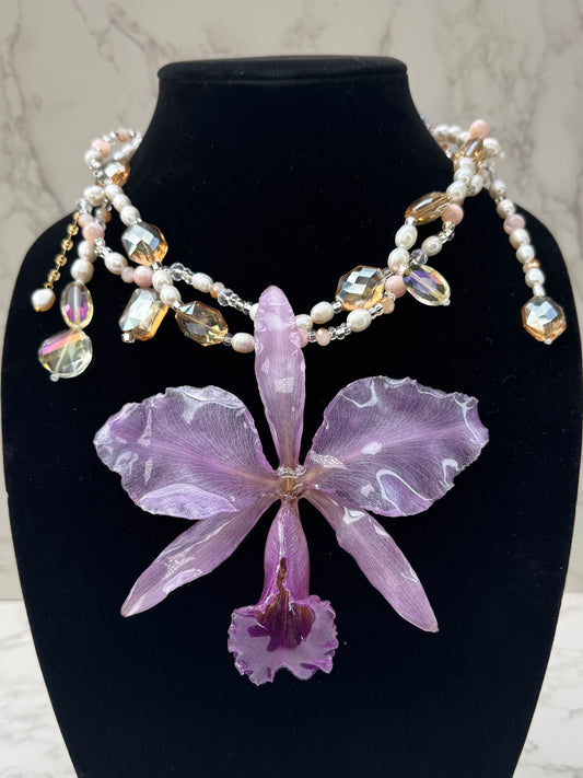 Blush Lavender Cattleya Natural Purple Cattleya Orchid Necklace – Freshwater Pearls & Crystal Beads