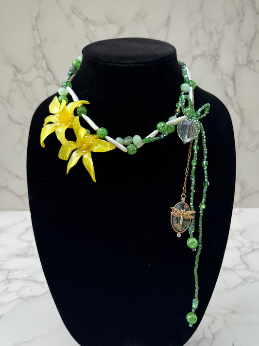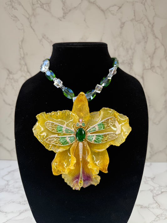 Golden Dragonfly Yellow Orchid with Dragonfly – Green & Clear Crystal Necklace | Handmade Floral Jewelry