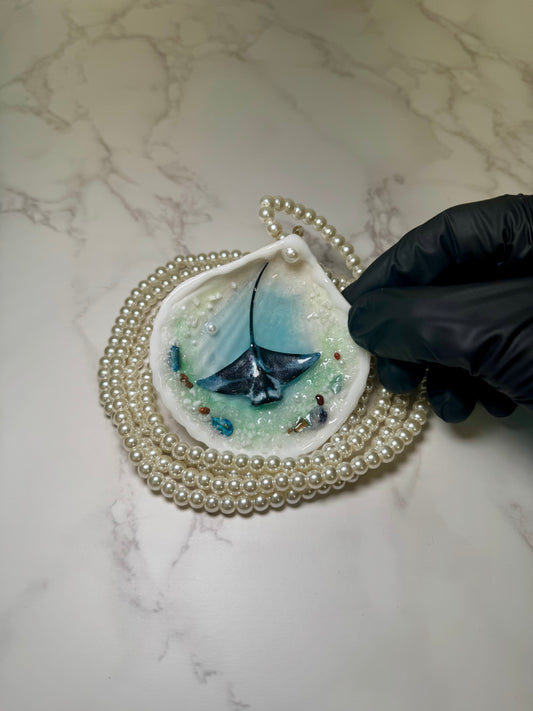 Pearl Handmade Manta Ray Necklace Encapsulated in Real Shell with UV Resin on Pearl Strand