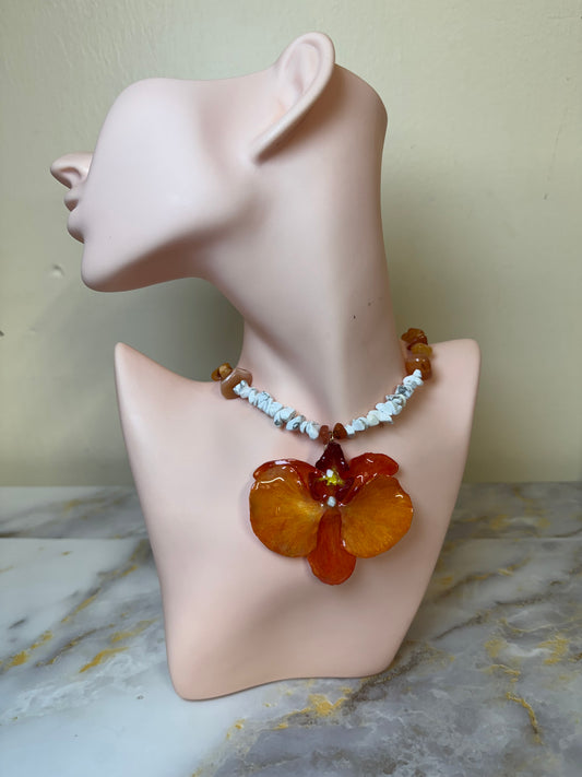 Orange Orchid dried in silica gel and preserved in ultraviolet Resin Necklace Made with Natural Stone Accents