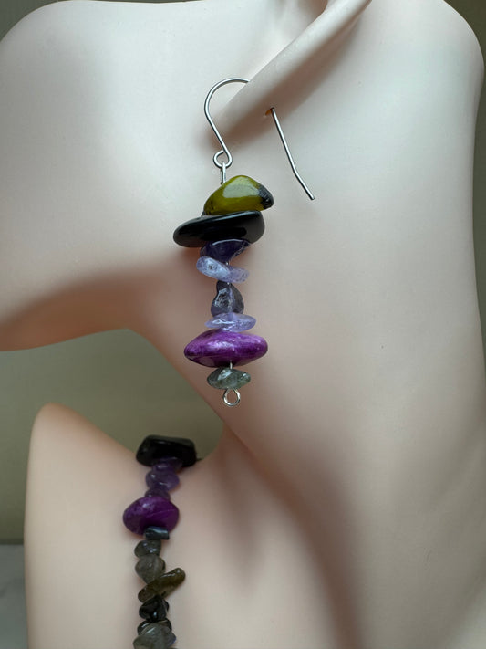 Real Purple Orchid Resin Necklace And Earring Set Made with Natural Stone Accents.