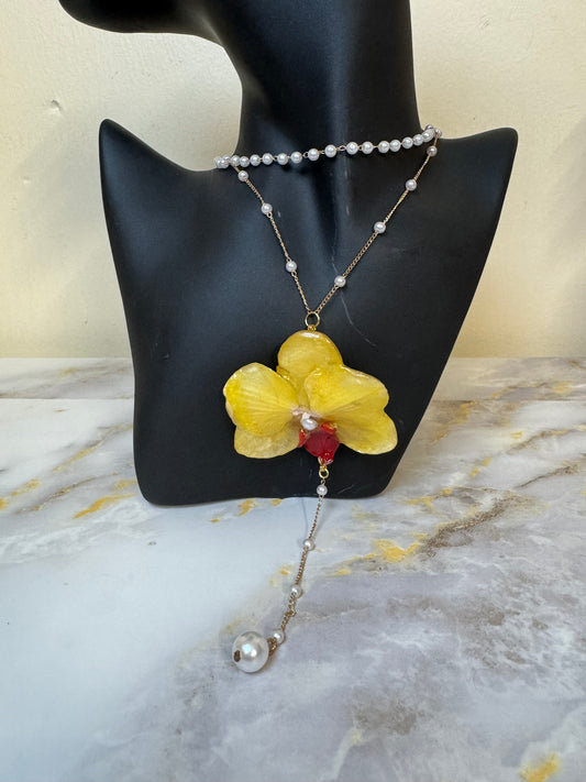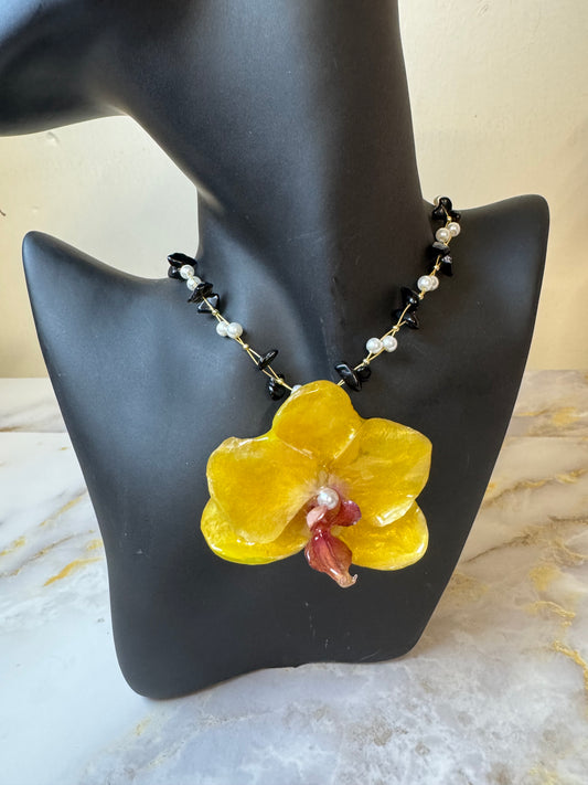 Real Yellow Orchid dried in silica gel and preserved in ultraviolet Resin Necklace made with small pearls and small black crystals