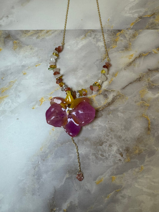 Real Pink-Purple-Yellow Orchid Real orchid dried in silica gel and preserved in ultraviolet Resin Necklace Made with Natural Stone Accents
