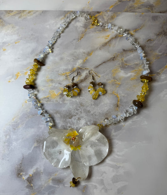Real White Orchid Resin Necklace And Earring Set Made with Natural Stone Accents.