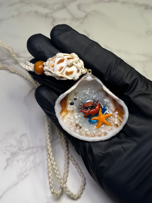 Red Crab And The Little yellow star Shell Necklace - Encapsulated in Real Shell with UV Resin