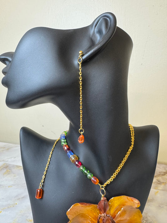 Real Orchid Resin Necklace And Earring Set Made with Natural Stone Accents.