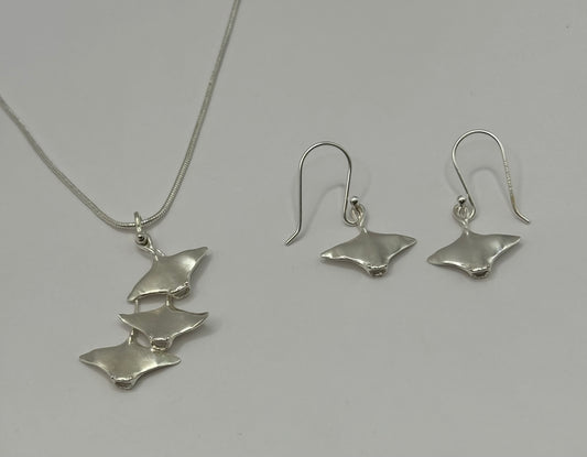 Three Manta Rays Necklace and Earrings Set, Handcrafted in 925 Sterling Silver for Ocean and Marine Life Lovers, Jewelry Made in USA