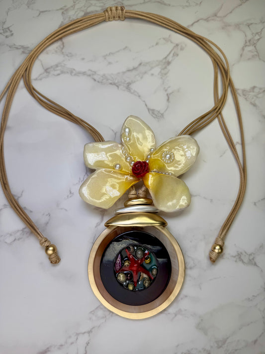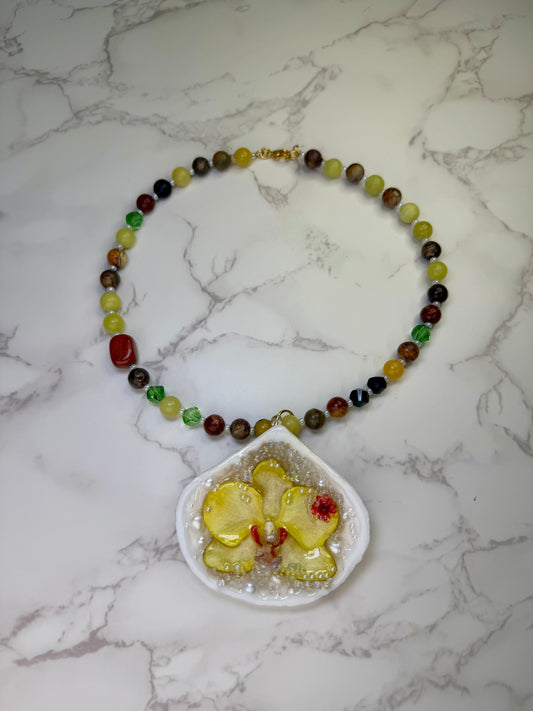 Golden Ember Orchid Natural Flower Preserved in Resin Yellow real exotic hybrid cattleya orchid with vibrant red spots with Stone-pearls Necklace combined with a mini Arrecife Fish in Natural Shell