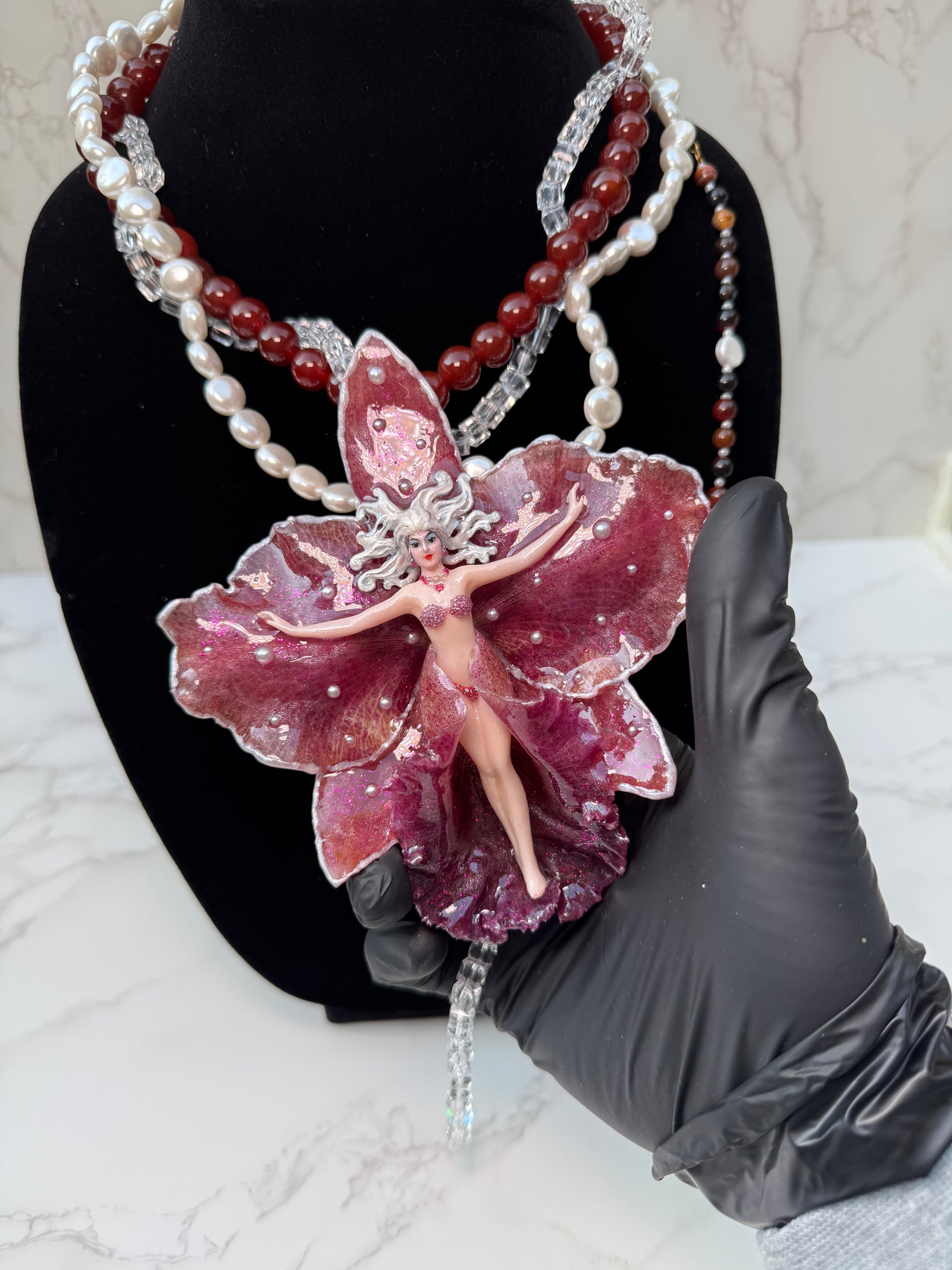 Calista – LIMITED EDITION – NYFW EXHIBITION PIECE Real Dark Purple Orchid with White Edges, Hand-Carved Female Figure, Mother-of-Pearl, Freshwater Pearls and Clear & Crimson Crystal Necklace