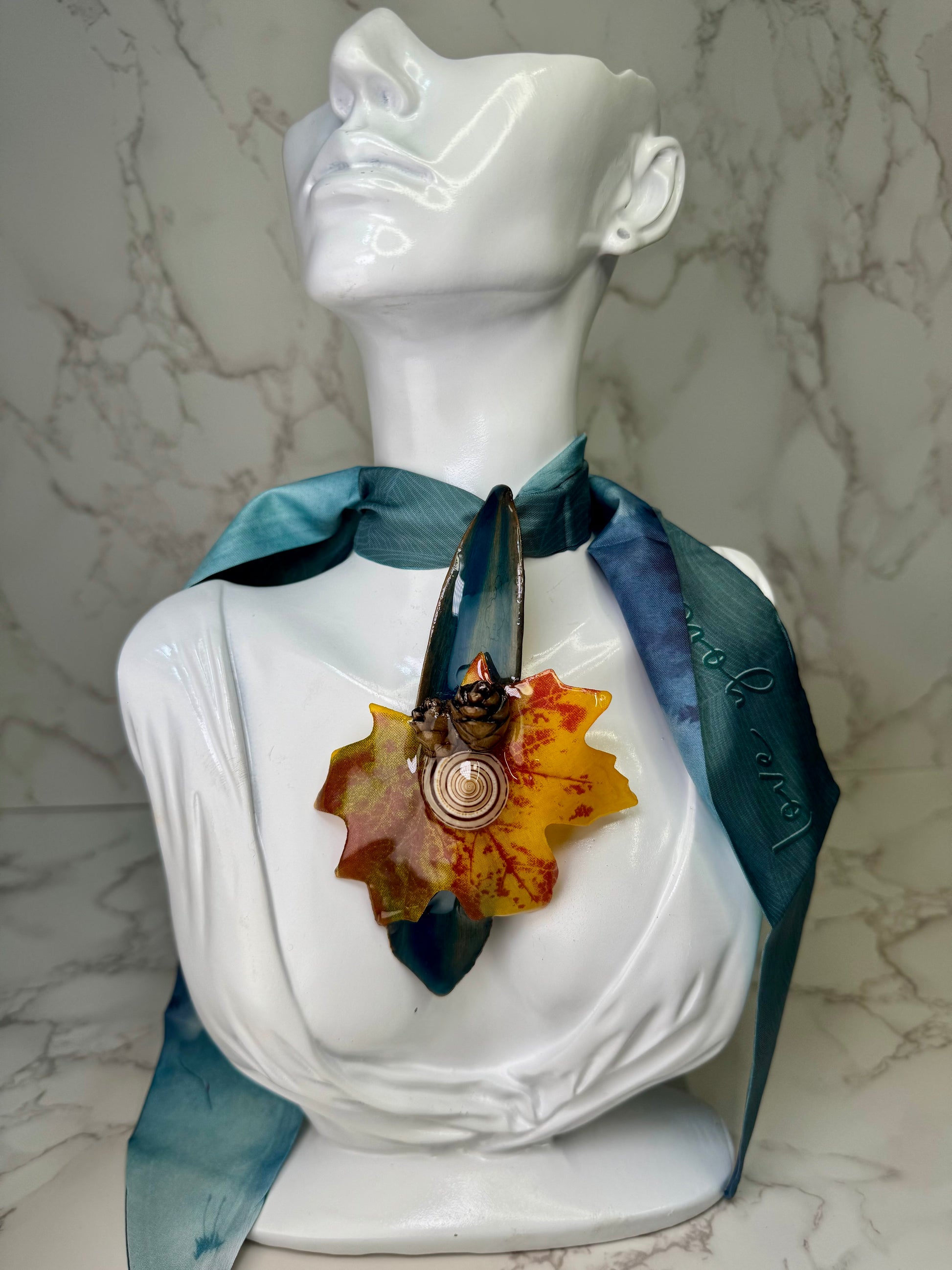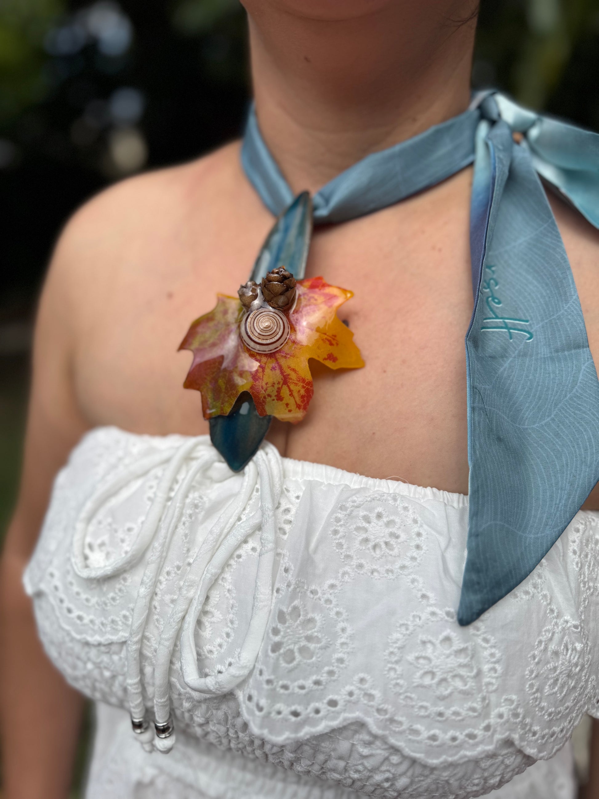 Este collar fue creado especialmente para ti con una hoja de arce de imitación en tonos naranja y rojo moteado, una pequeña concha marina, dos bellotas miniatura, una hoja de mangle azul y una bufanda celeste, encapsuladas en resina epóxica. Cada detalle fue trabajado a mano como homenaje a la serenidad del otoño y la conexión entre la tierra y el mar.