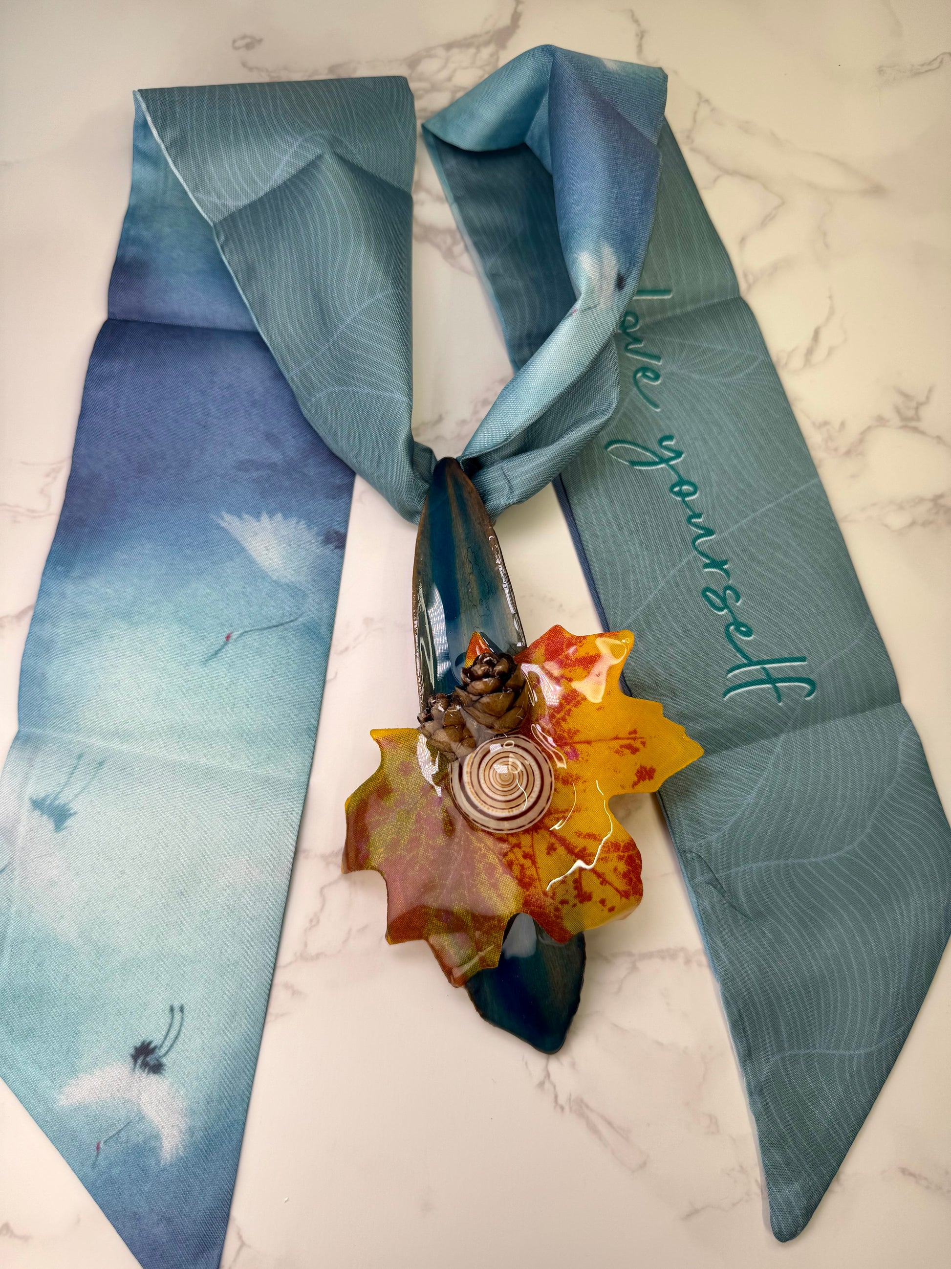 At its center rests an orange and red spotted imitation maple leaf, glowing with the warmth of fall. Nestled within lies a tiny seashell, symbol of calm and reflection — the ocean’s whisper preserved in stillness. Framing the design, two miniature acorns evoke strength and new beginnings, while a delicate blue mangrove leaf adds harmony and balance. A soft baby blue scarf drapes through the composition, bringing a touch of serenity and dreamlike grace.