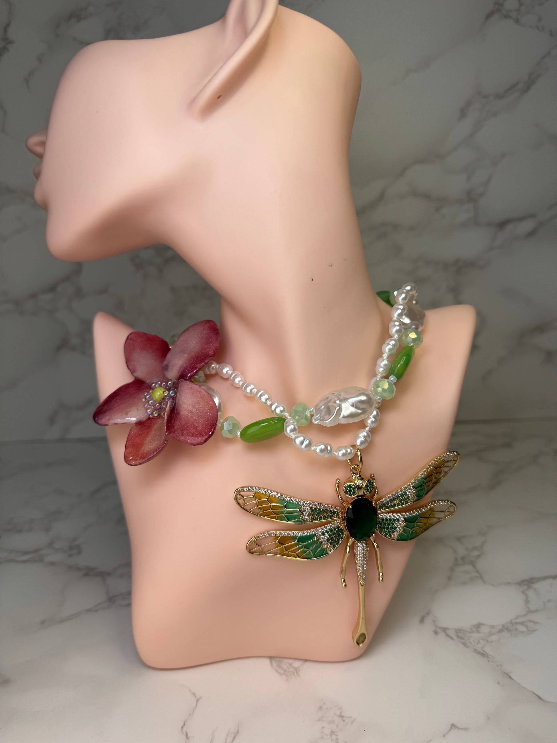 Este collar fue creado especialmente para ti con una flor en tonos rojo y rosado, acompañada de una hermosa libélula de joyería en verde y dorado. Cada detalle fue trabajado a mano como símbolo de transformación, elegancia y la magia delicada de la naturaleza.