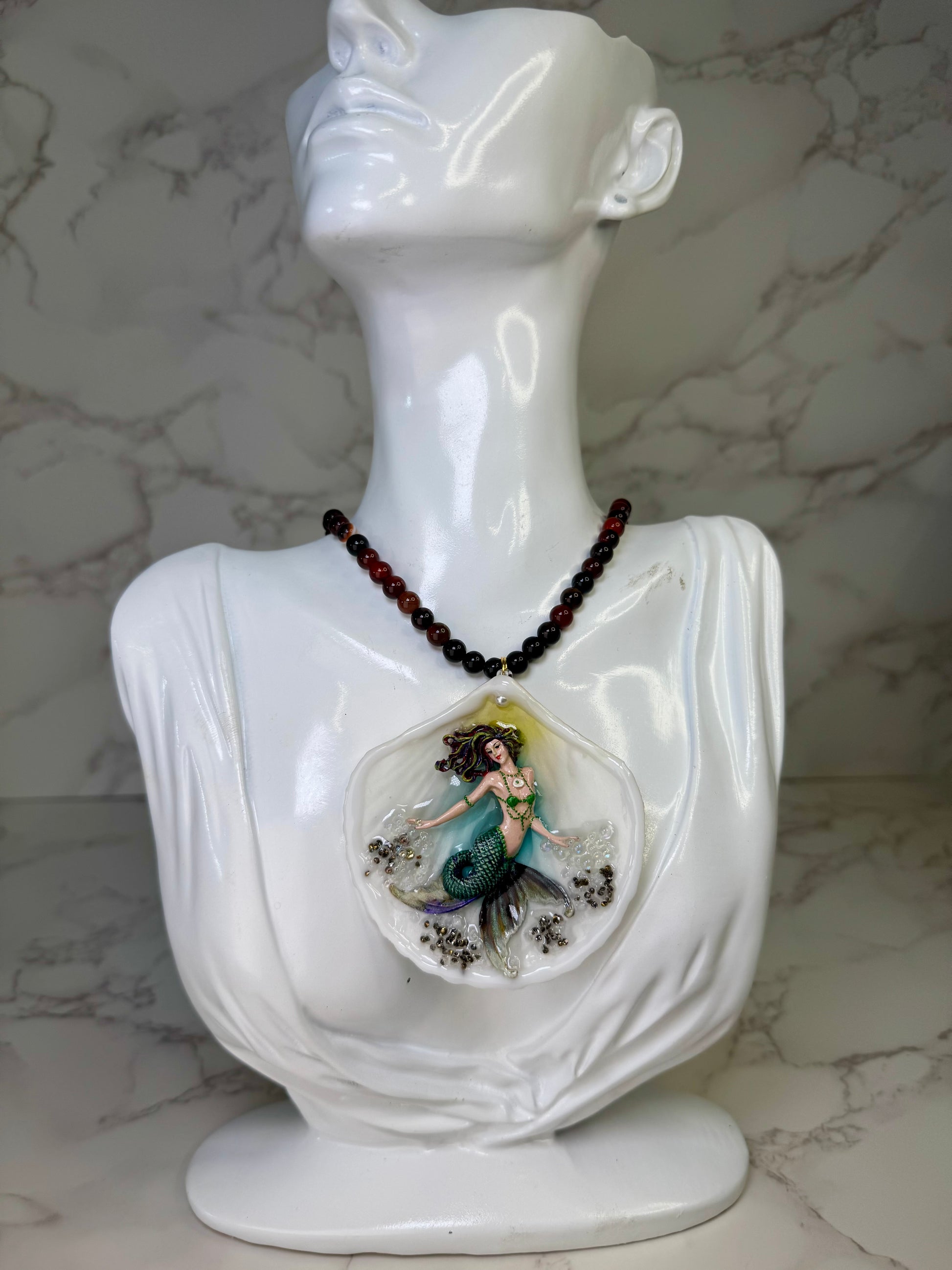 Emerald Dawn Siren Natural seashell featuring a handmade craft metal mermaid with brown hair, yellow highlights, and a vibrant green tail preserved in Clear Resin Beautiful Stones Necklace