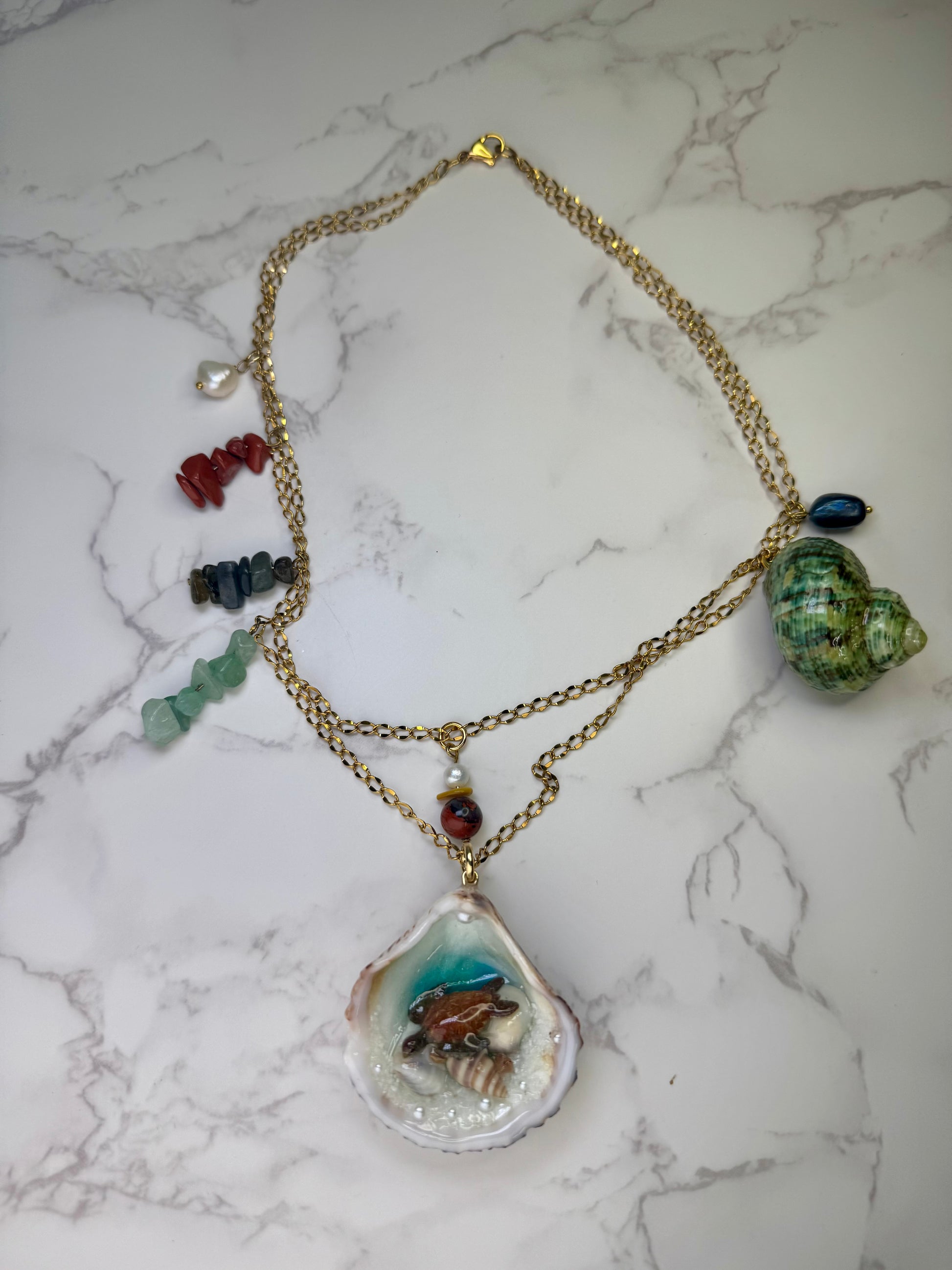 Este collar fue creado especialmente para ti con una concha marina natural, una diminuta tortuguita en su interior y un dije de concha en tonos verde claro y verde oscuro. Cada detalle fue trabajado a mano como símbolo de serenidad, protección y la belleza tranquila del océano.
