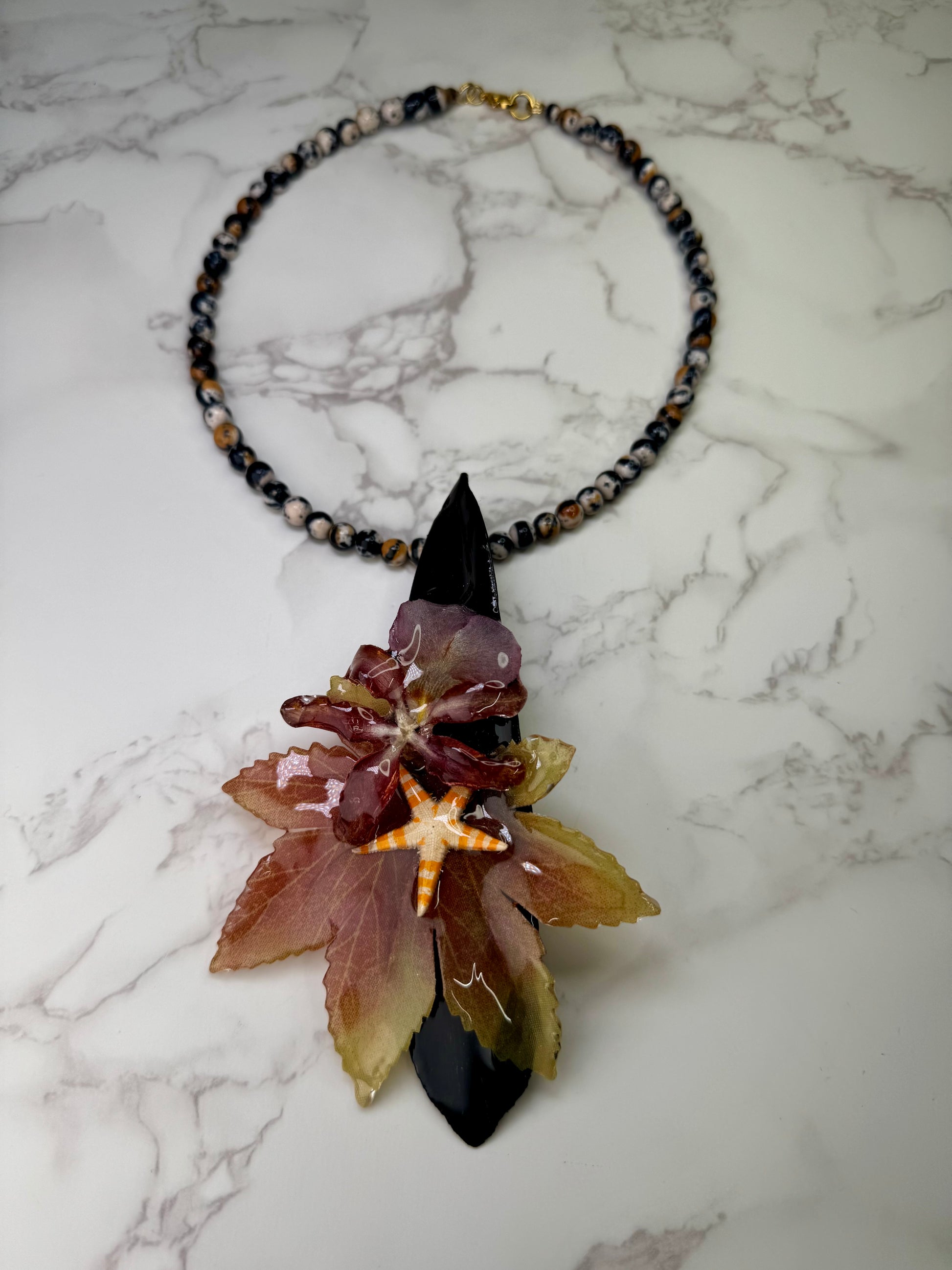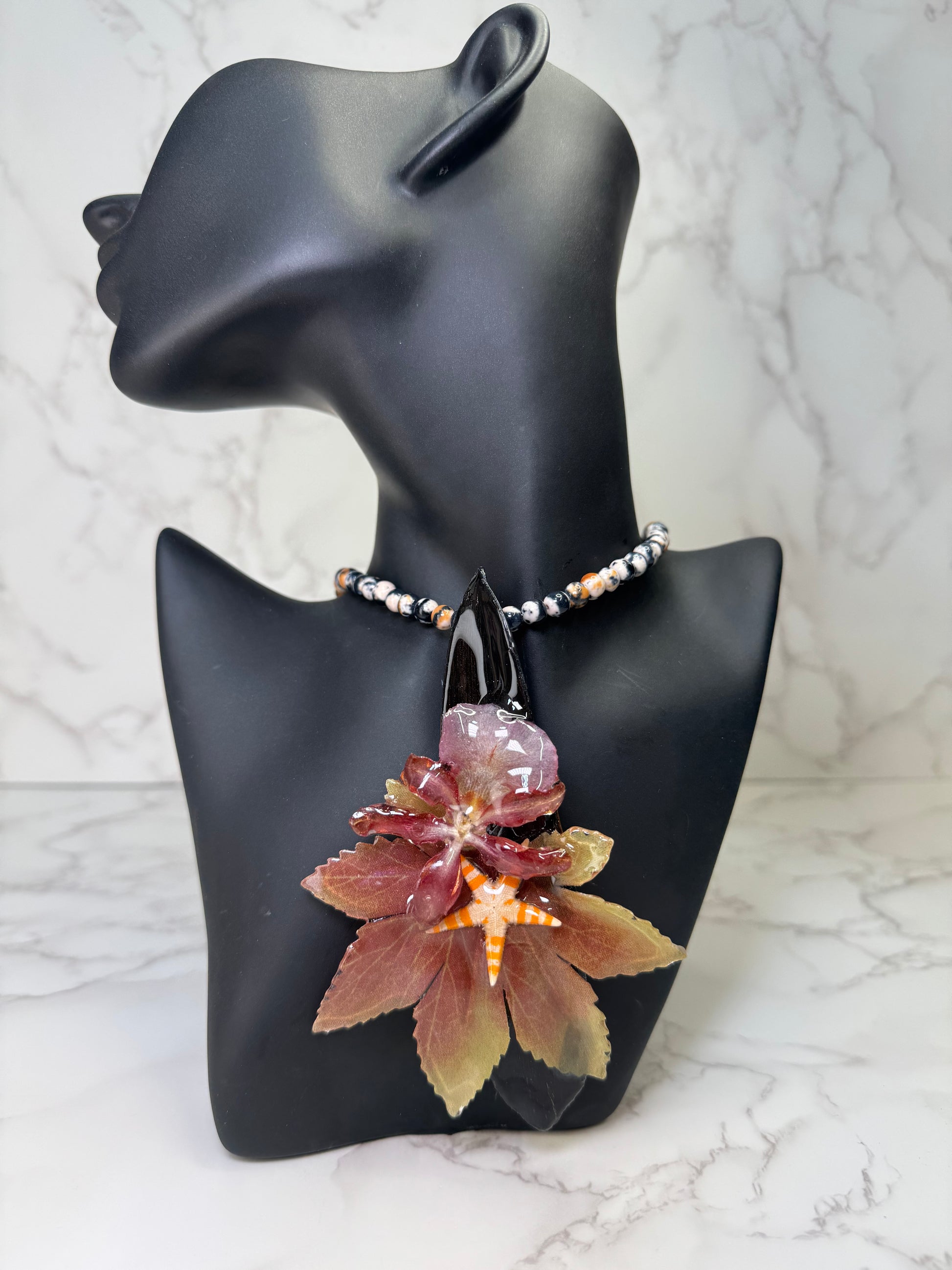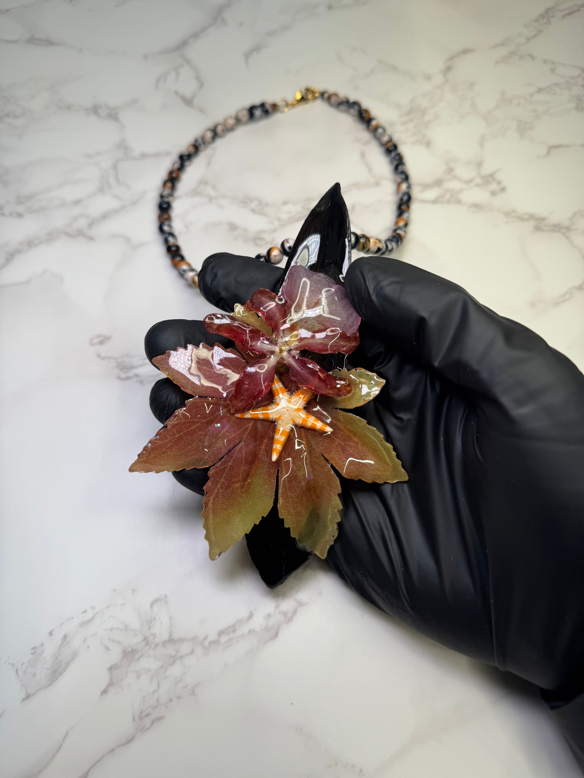 Este collar fue creado especialmente para ti con una hoja de arce de imitación en tonos marrones y amarillos, una pequeña estrella blanca y anaranjada, una flor de Cataleya y una hoja de mango. En la base cuelga una piedra de cristal en tonos marrón, negro y blanco, símbolo de equilibrio y fortaleza. Cada detalle fue encapsulado en resina epóxica, creando una pieza única inspirada en la calma y el poder del otoño.