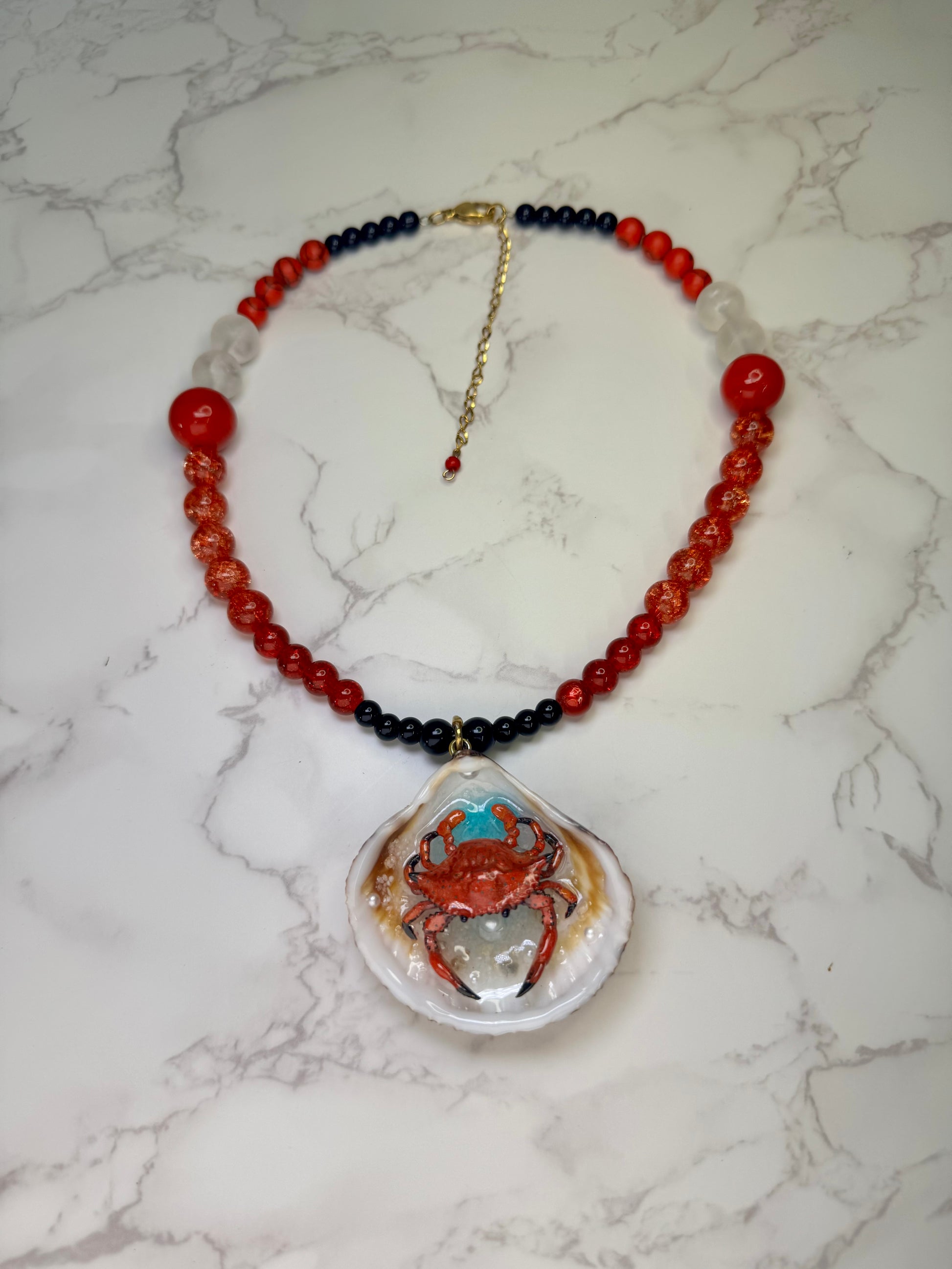 Hanging below, a beautiful glass ball necklace in black, red, and orange glows like embers swirling beneath the waves. Its warm, molten palette mirrors the intensity of the crab inside the shell — deep black for grounding, vibrant red for passion, and glowing orange for creativity and warmth. Together, the colors create a dramatic and harmonious balance.