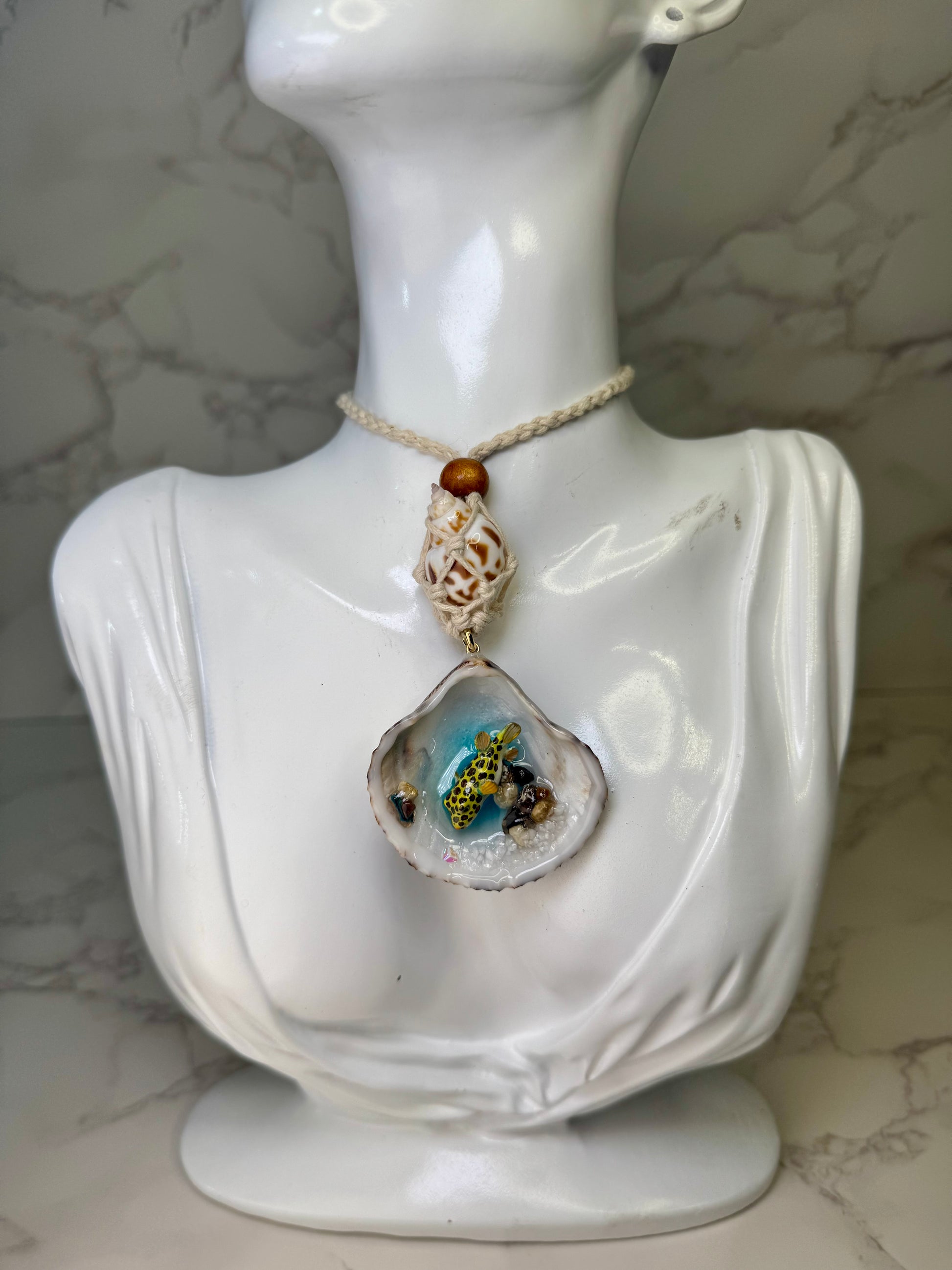Este collar fue creado especialmente para ti con una concha natural, un pez globo amarillo con puntos negros, diminutos pedacitos de coral y pequeñas conchitas que evocan la belleza vibrante del arrecife. Cada detalle fue trabajado a mano como símbolo de alegría, ternura y la magia del mar.