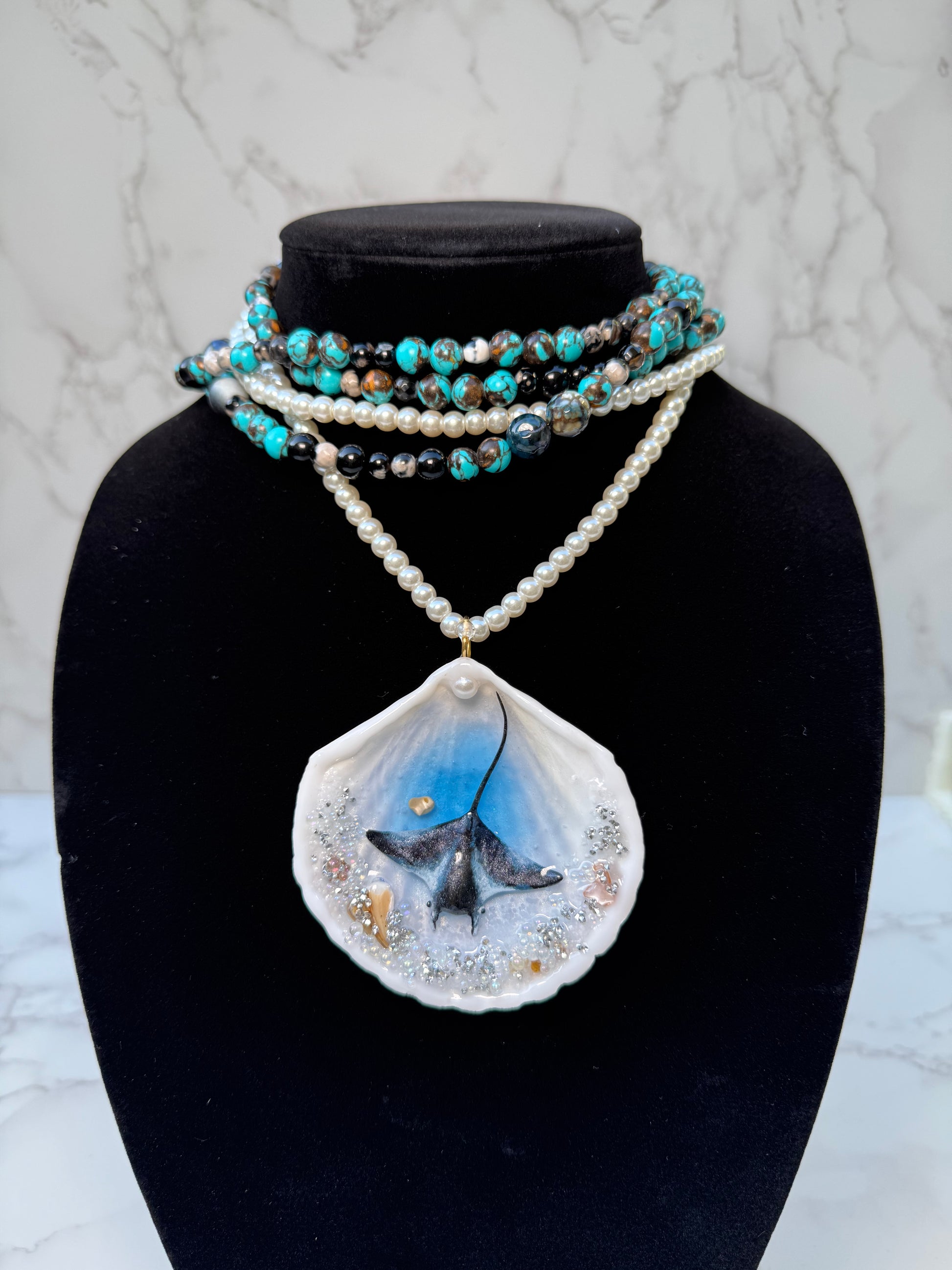 🌊 Materials: natural seashell, realistic manta ray, coral fragments, natural rock, pearl necklace, blue and black stones, epoxy resin, UV protection