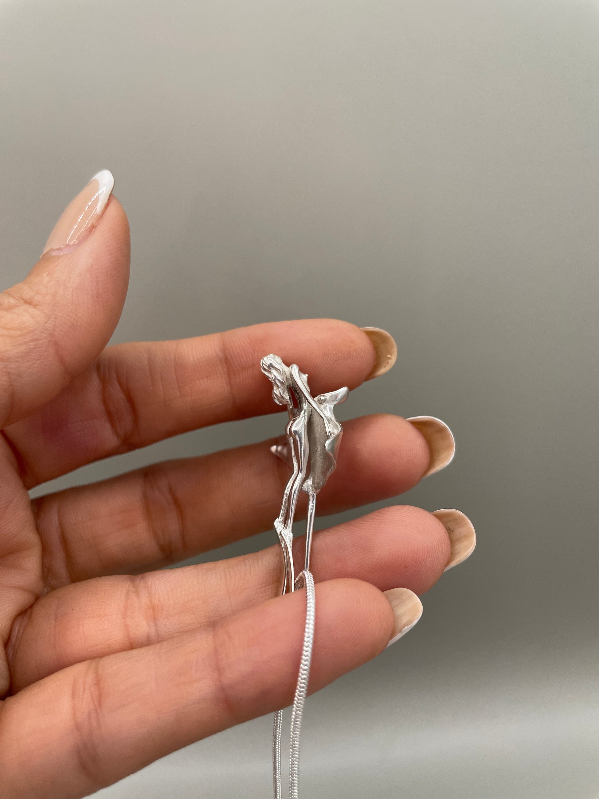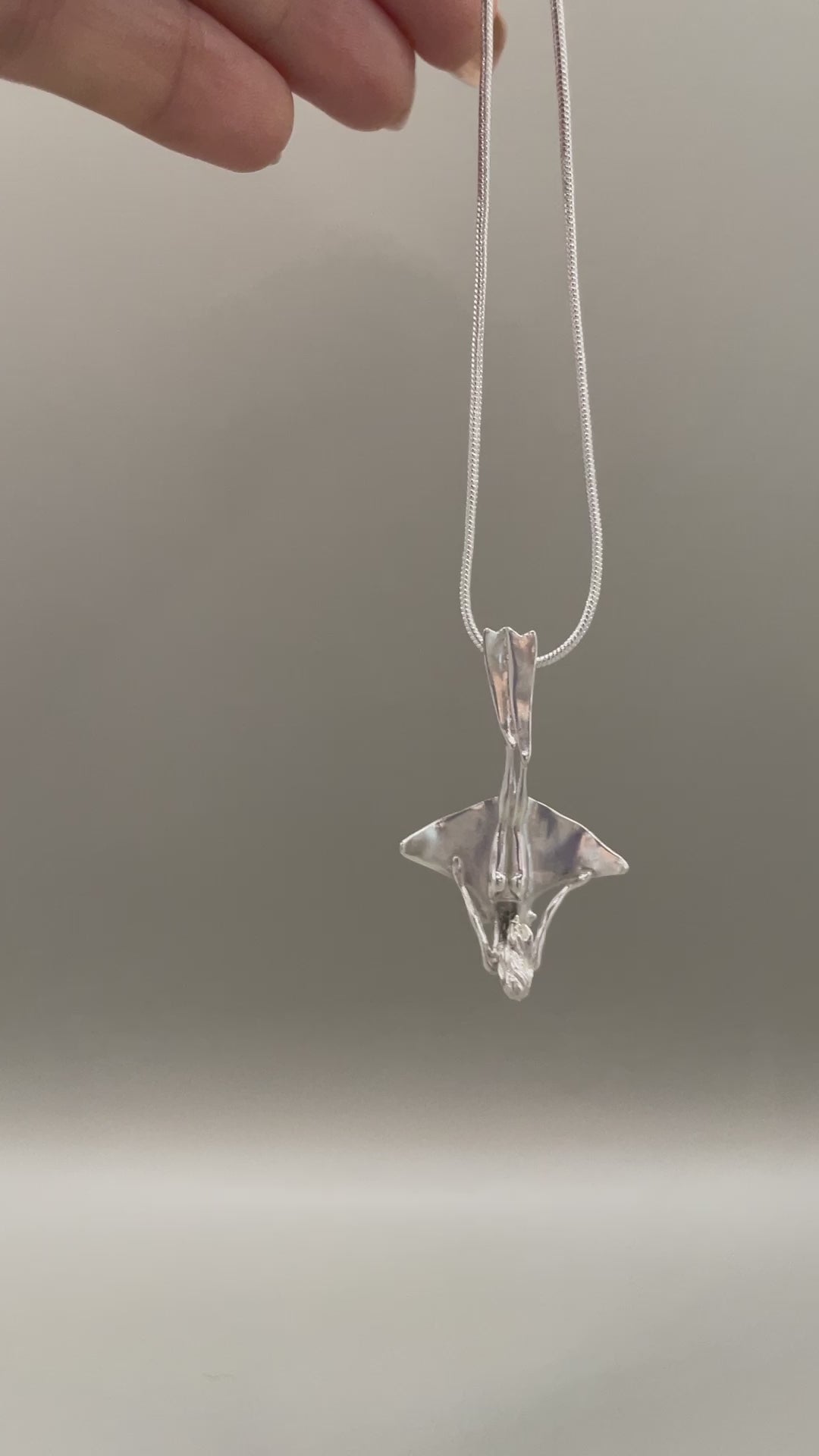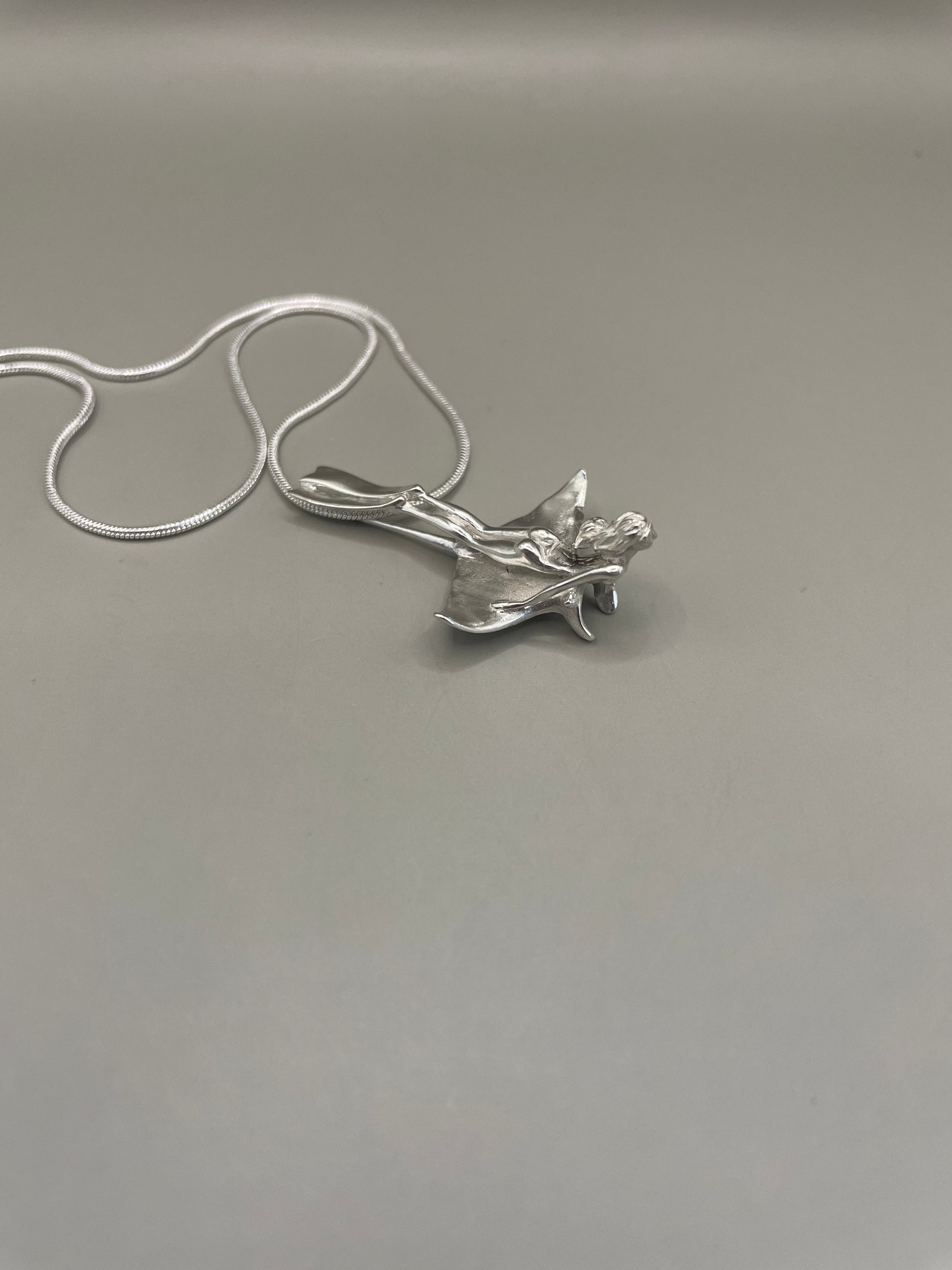 Scuba Girl Riding Manta Ray Necklace, Handcrafted 3D Pendant in 925 Sterling Silver, Unique Design Sea-Life Inspired for Marine Life Enthusiasts. Handmade in USA