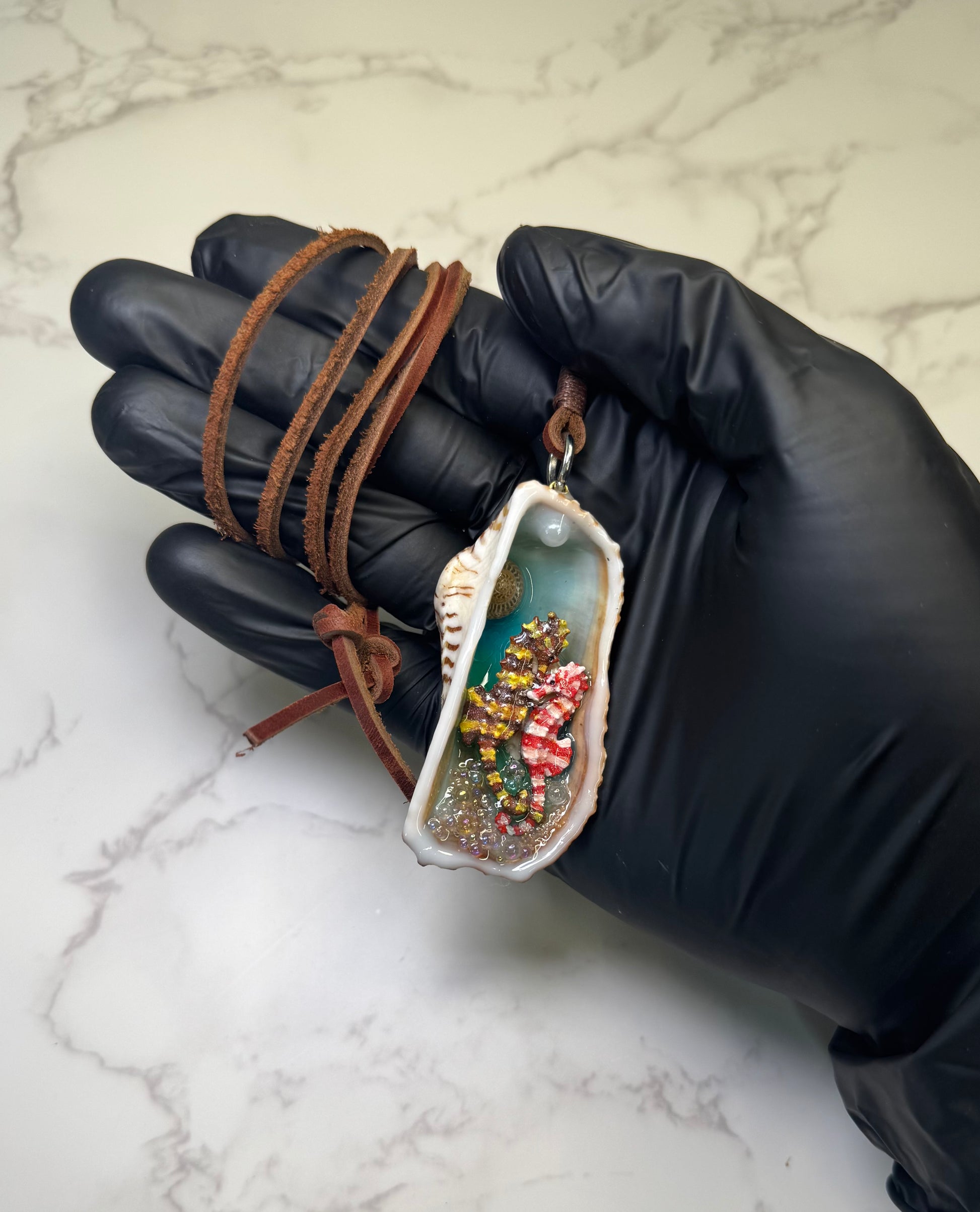 🌊 Materials: exotic seashell, miniature seahorses, clear micro-balls, sand, epoxy resin, UV protection