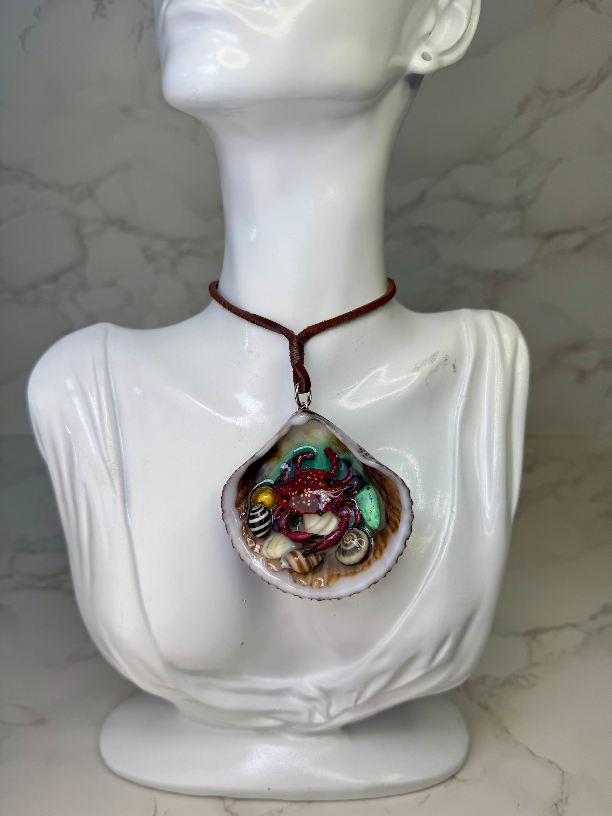 At its heart rests a natural seashell, shaped by the rhythm of the tides and symbolizing intuition, protection, and the enduring magic of the sea. Nestled inside, a brilliant red crab decorated with blue and yellow spots becomes the striking centerpiece of this tiny ocean stage. Its vivid colors echo coral reefs lit by sunlight, symbolizing courage, adaptability, and vibrant self-expression.