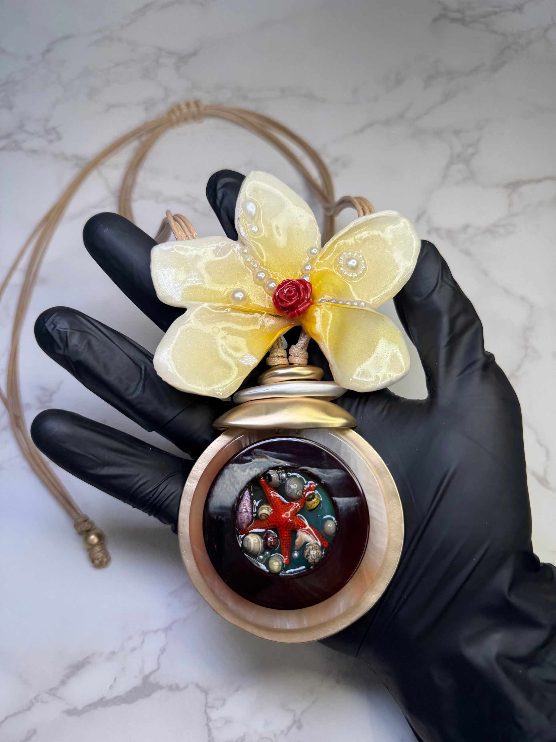 🌼 Materials: yellow flower, miniature red rose, imitation pearls, glass crystal sphere, tiny red starfish, assorted small seashells, epoxy resin, UV protection