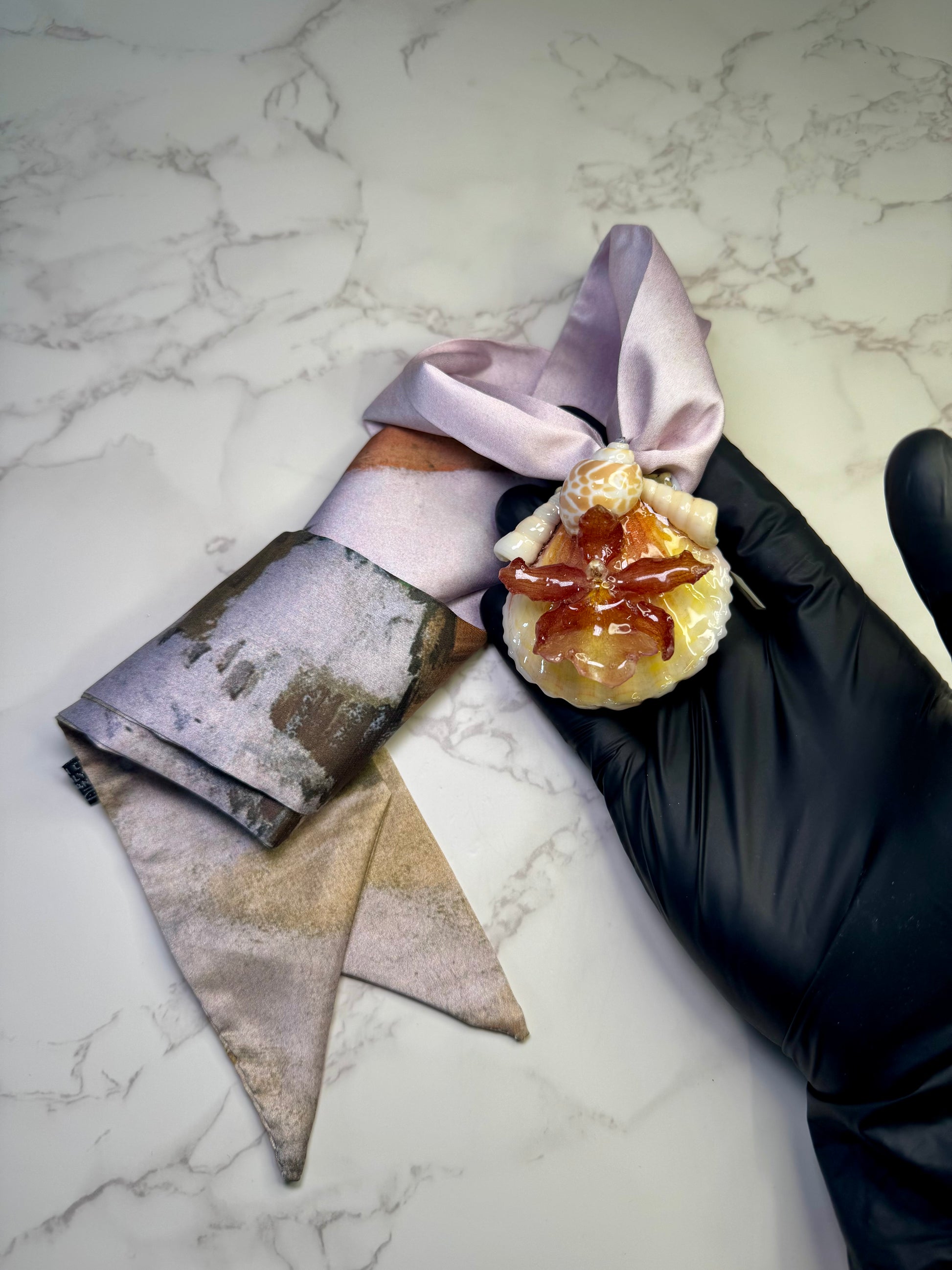 Soft, graceful, and full of warmth, The Blush Tide captures the tender beauty of the sea in bloom. At its heart lies a beautiful natural seashell, polished by waves and time, glowing with the gentle light of the shore. Resting delicately upon it is a mini Cattleya orchid, its petite petals symbolizing elegance, purity, and renewal. Draped around them is a flowing scarf in hues of pink and brown, blending the romance of dawn with the earthy calm of the coast — a perfect harmony of softness and strength.