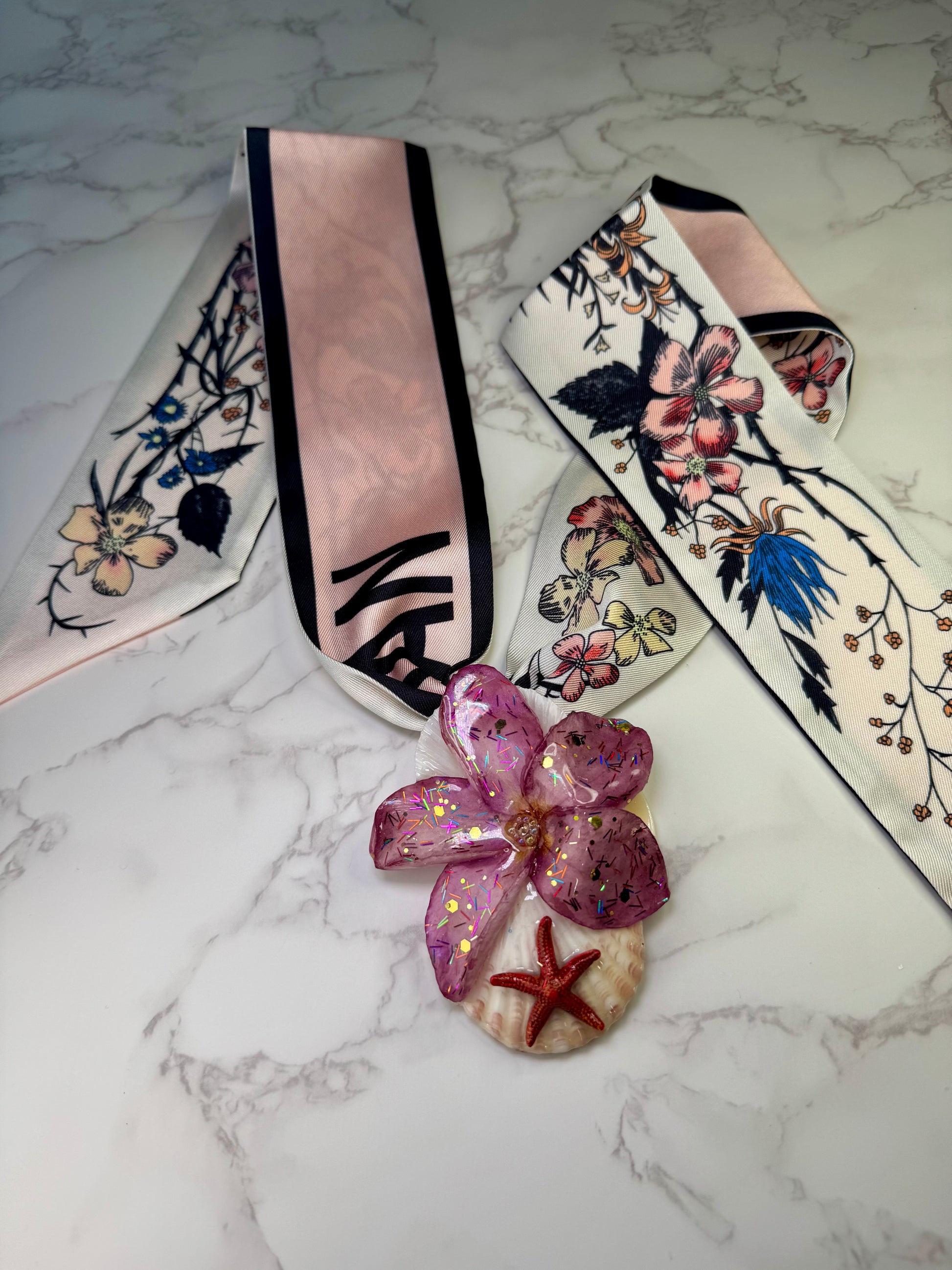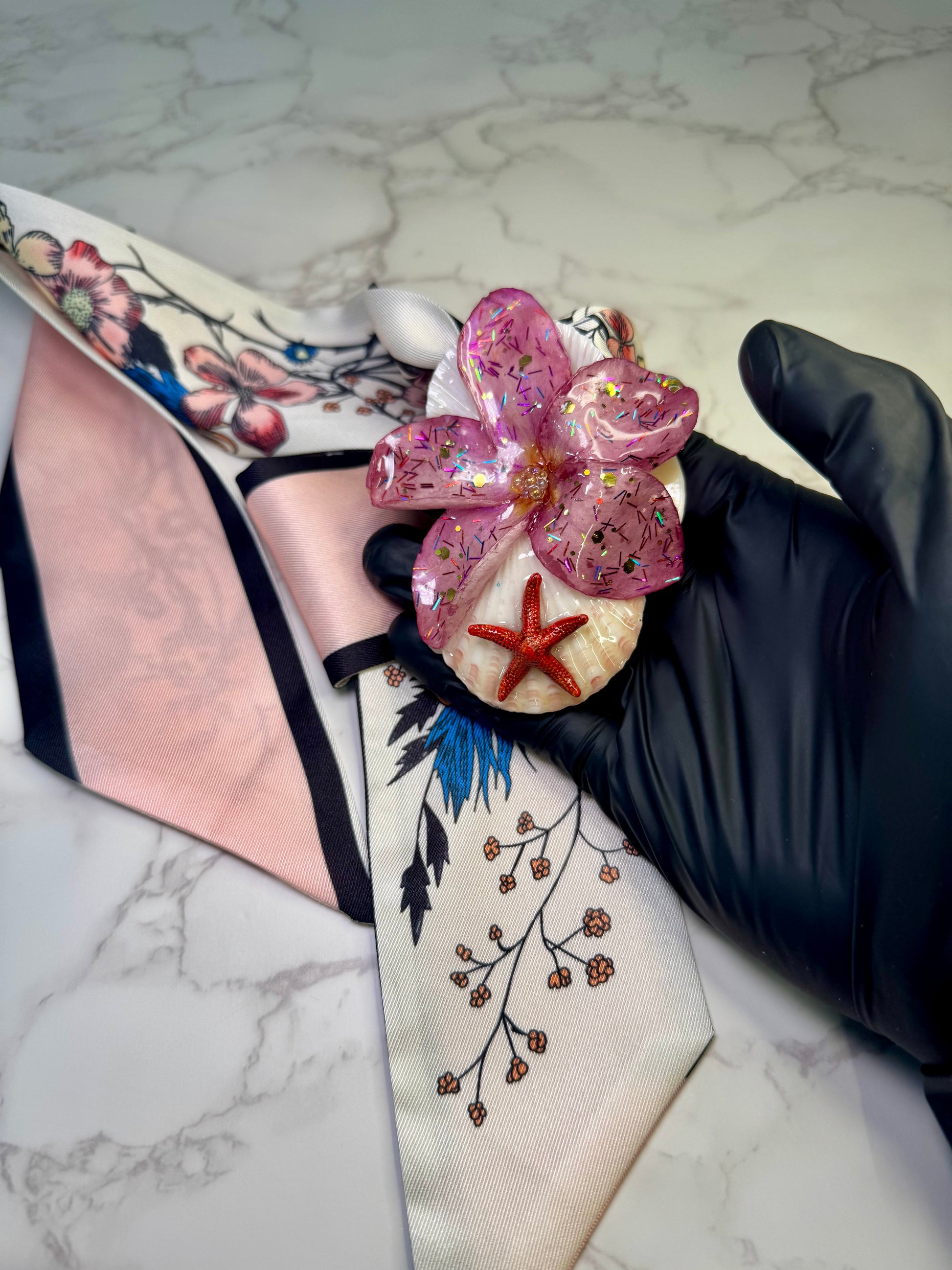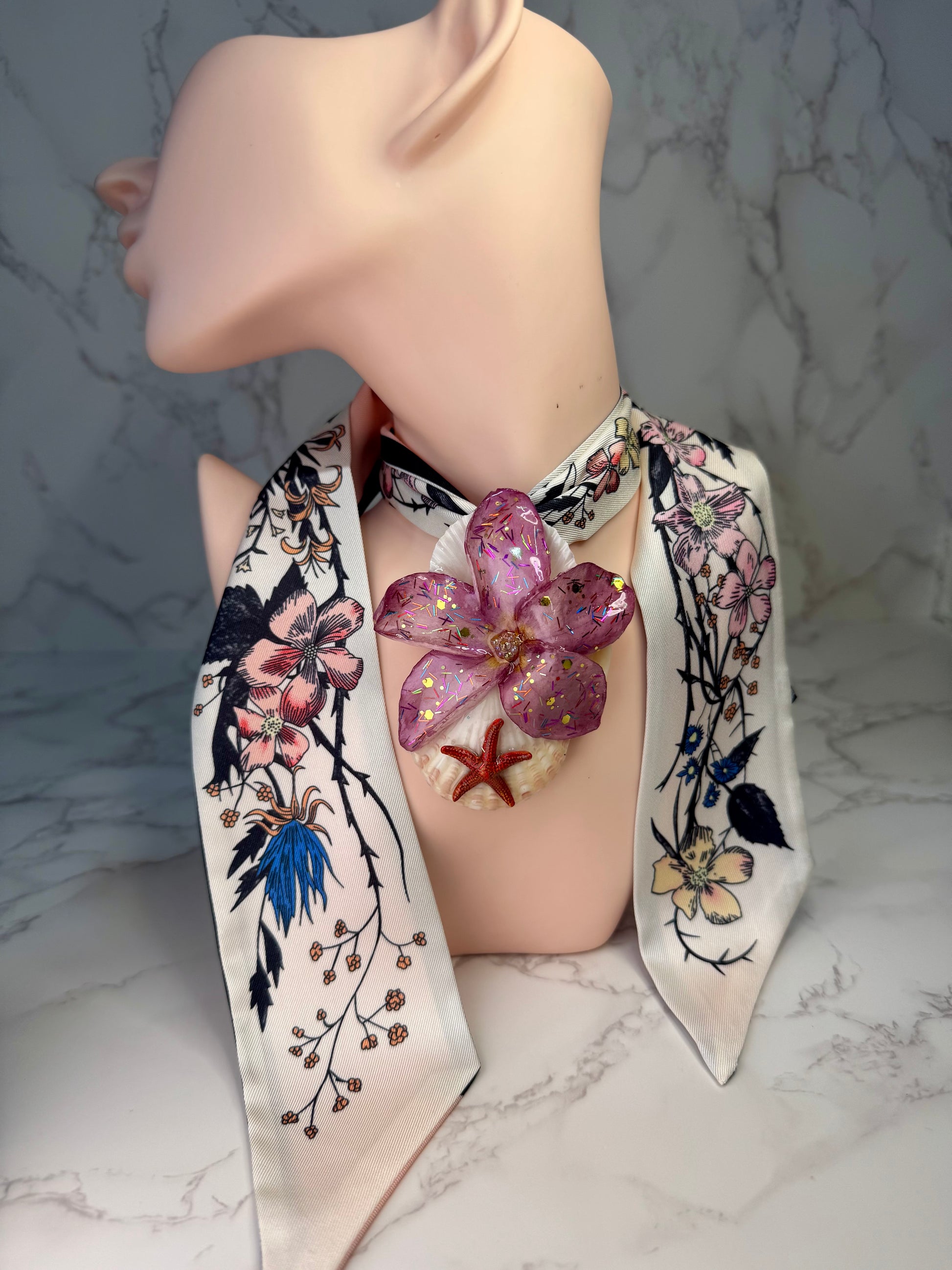 Charming and full of seaside sweetness, The Coral Kiss captures the playful spirit of summer wrapped in elegance. At its heart lies a delicate pink flower, soft and radiant like the first blush of dawn. Beside it rests a beautiful natural seashell, its curves kissed by the sea, while a bright orange starfish adds a joyful splash of color — a tiny sun glowing against the soft tones of the shore. Flowing gently around them is a scarf patterned in white and pink flowers, completing the piece with a touch of grace and romance.