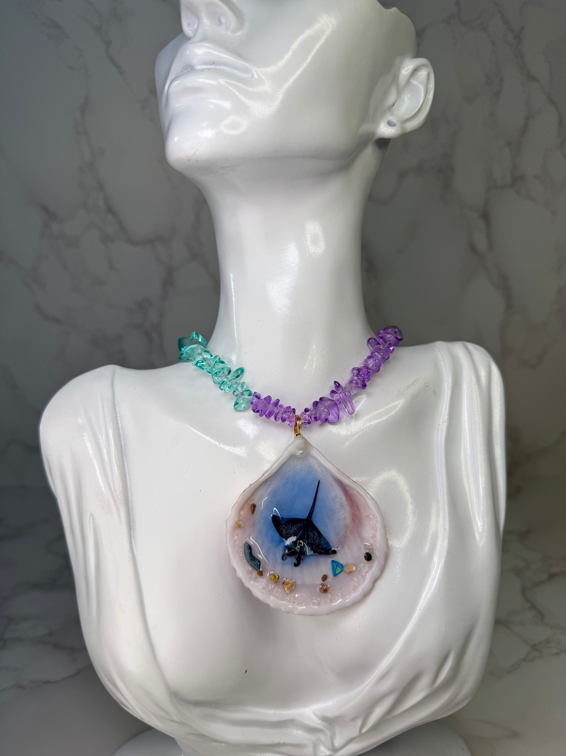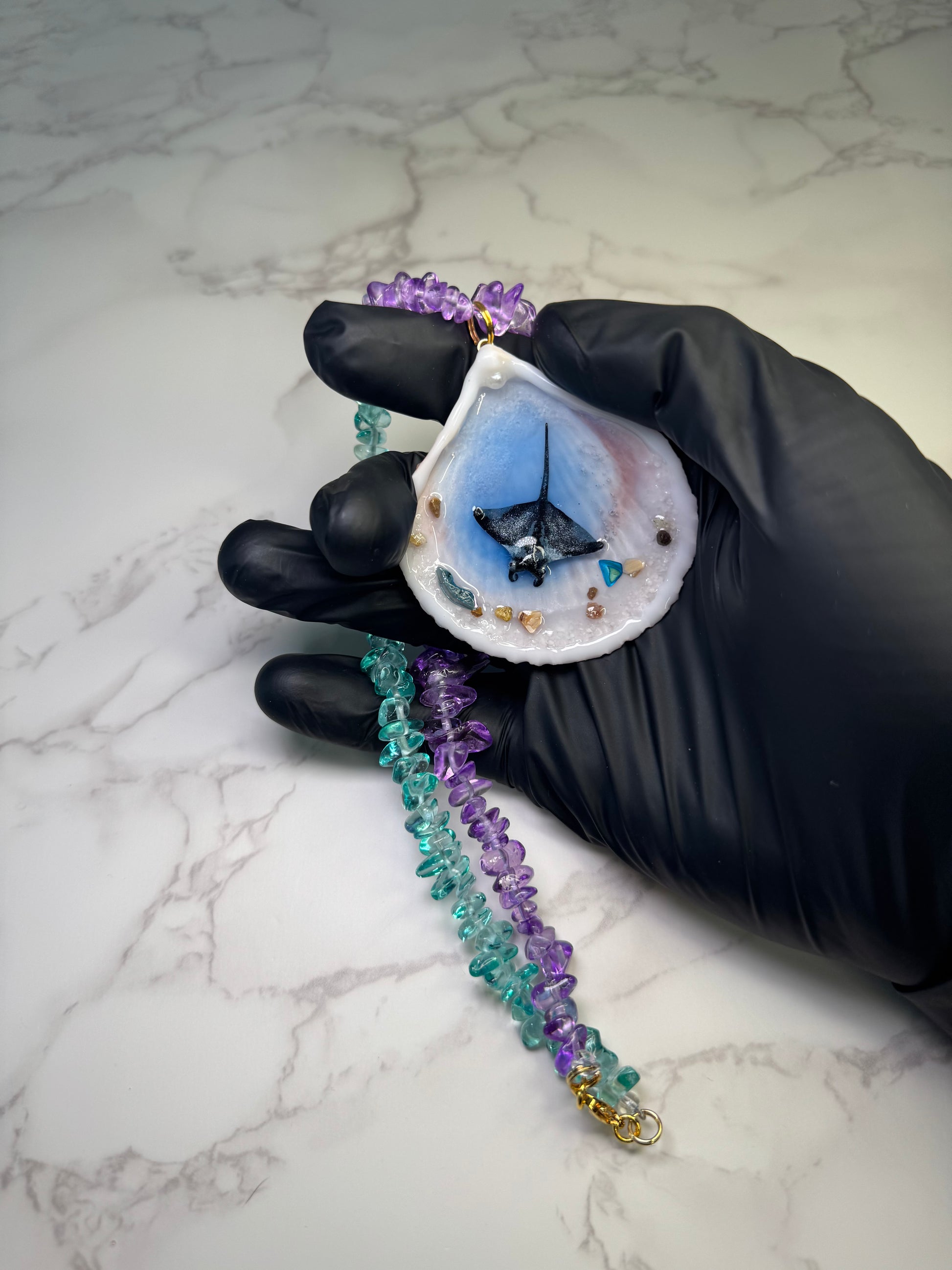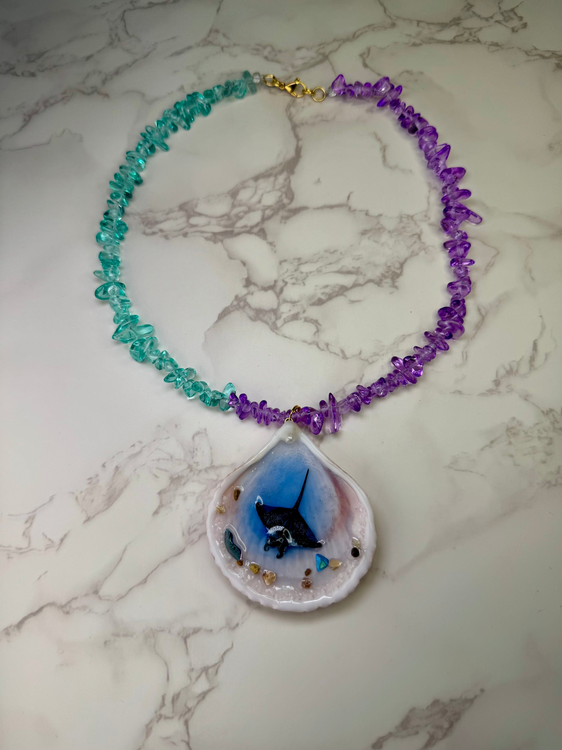 Este collar fue creado especialmente para ti con una concha marina natural, una mantarraya pintada a mano y piedras decorativas en tonos azul y púrpura encapsuladas en resina epóxica. Todo ha sido trabajado a mano, reflejando la profundidad y el misterio del océano.