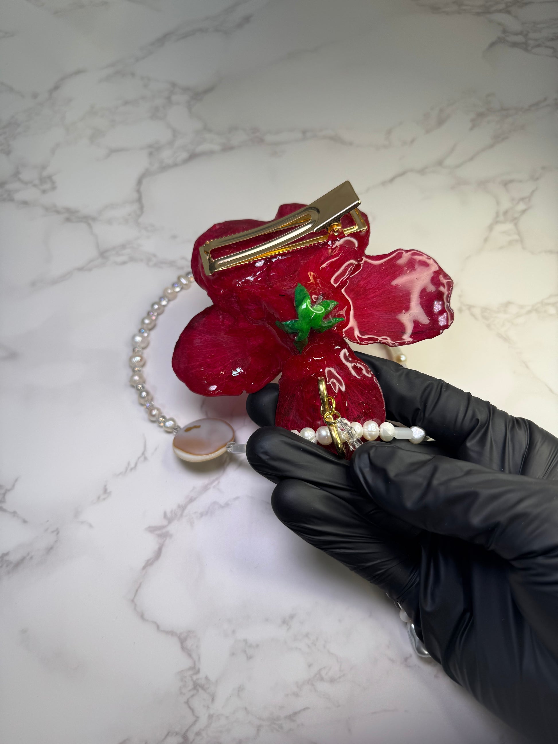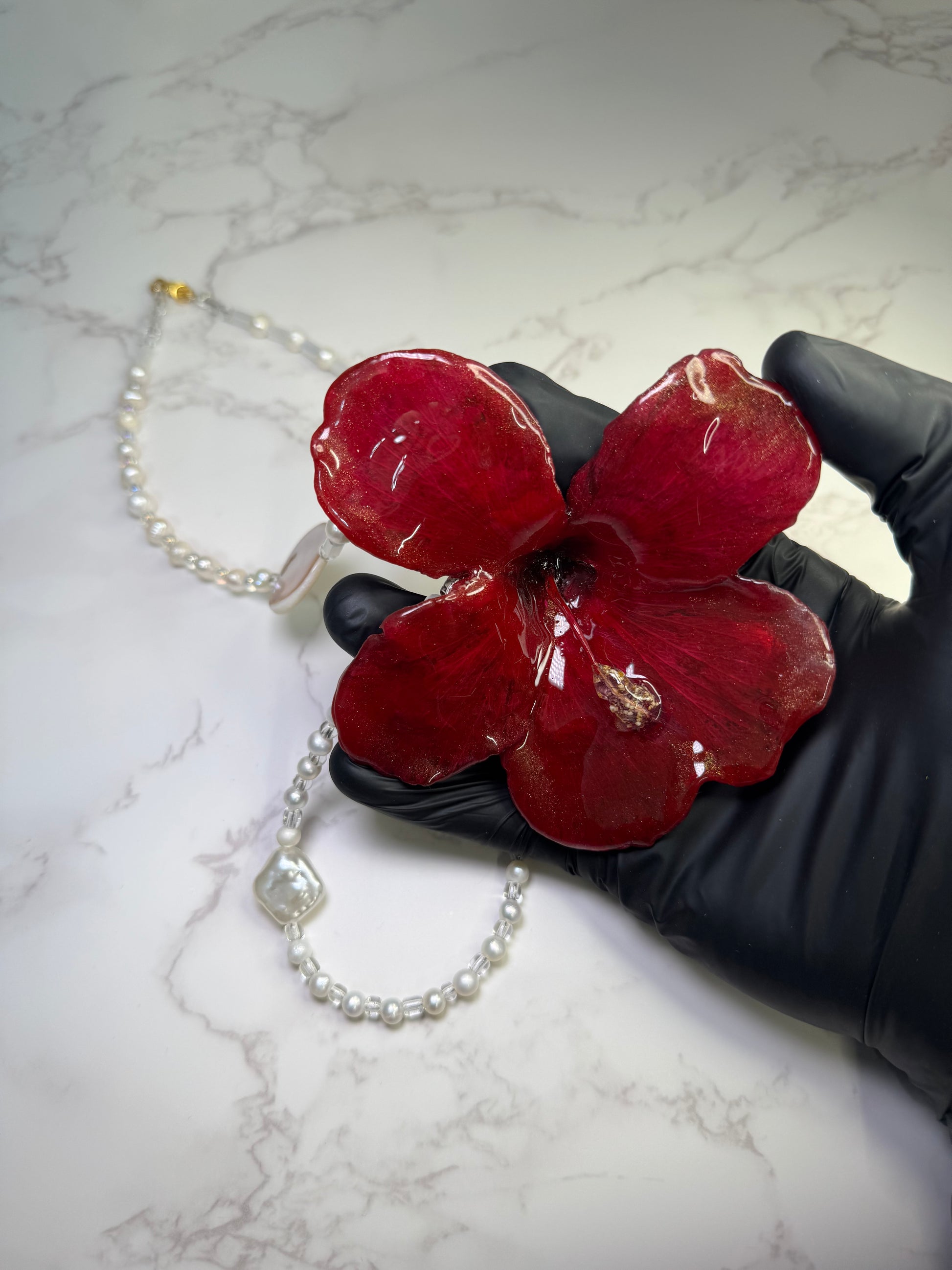 🌺 Materials: real hibiscus flower, epoxy resin, pearls, white crystal pieces, UV protection