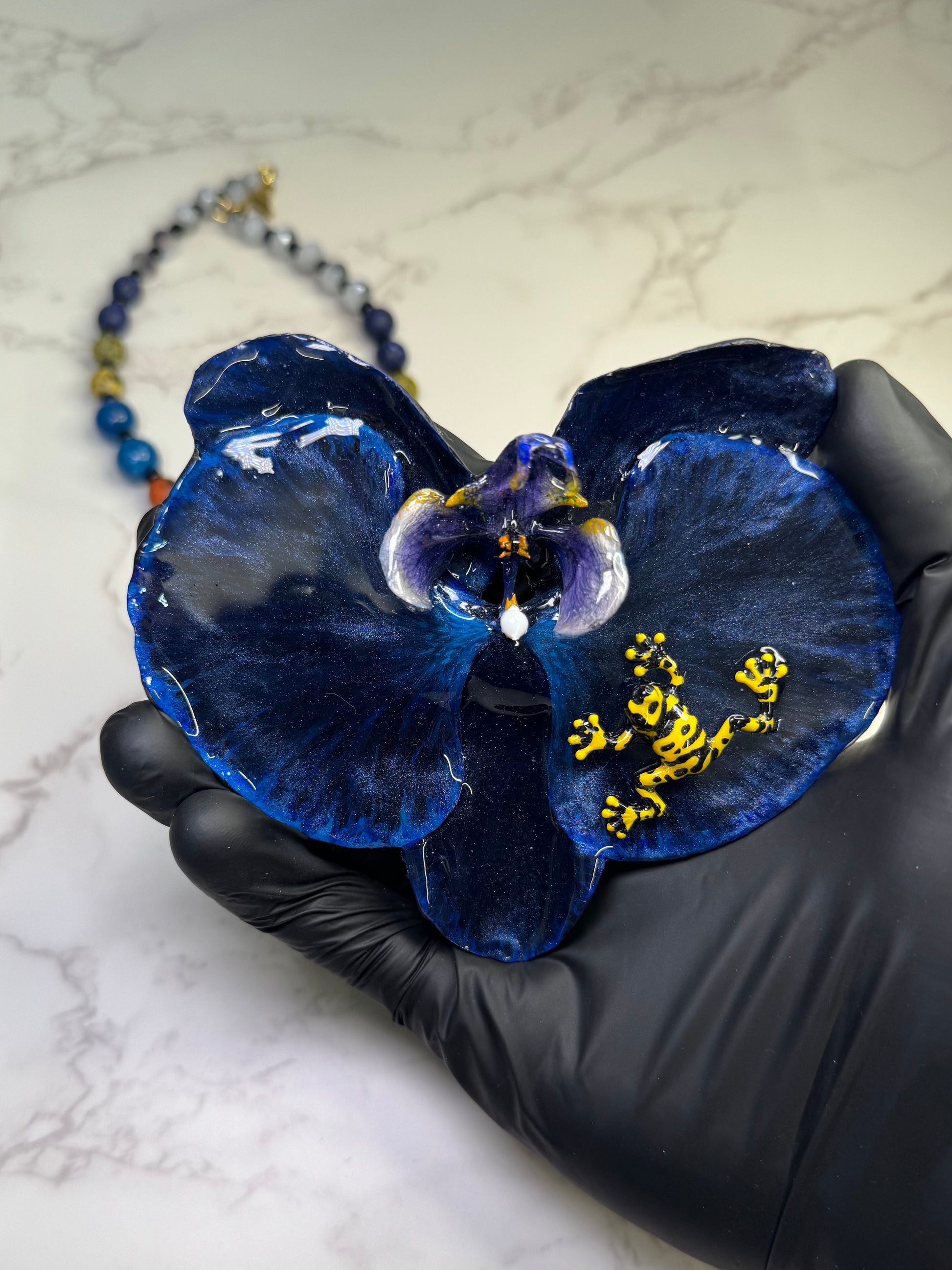 Este collar fue creado especialmente para ti con una orquídea natural de color azul oscuro y una pequeña rana venenosa decorativa en tonos negro y amarillo, encapsuladas en resina epóxica. Todo ha sido trabajado a mano, reflejando la exótica energía de la selva tropical.