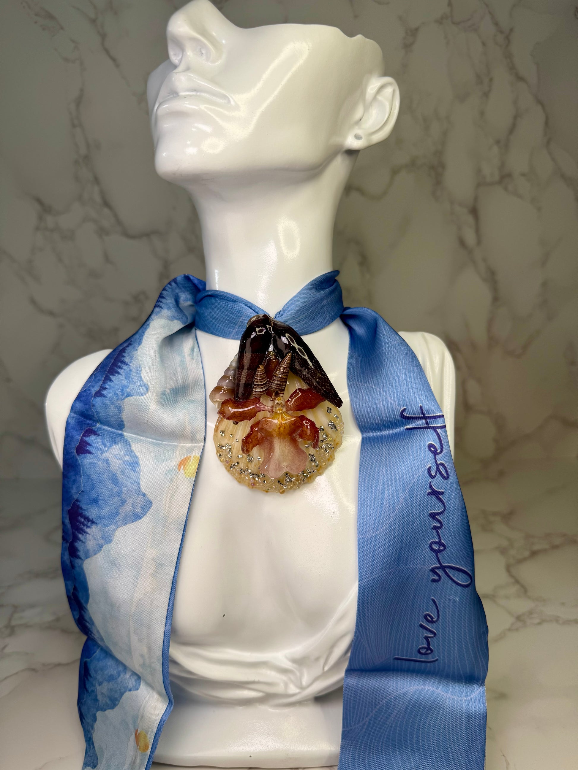 Encapsulated in crystal-clear epoxy resin, this handmade piece preserves a peaceful moment where ocean and bloom meet in harmony. Its fresh tones and graceful textures make it both timeless and luminous — a wearable reflection of the sea’s eternal poetry.