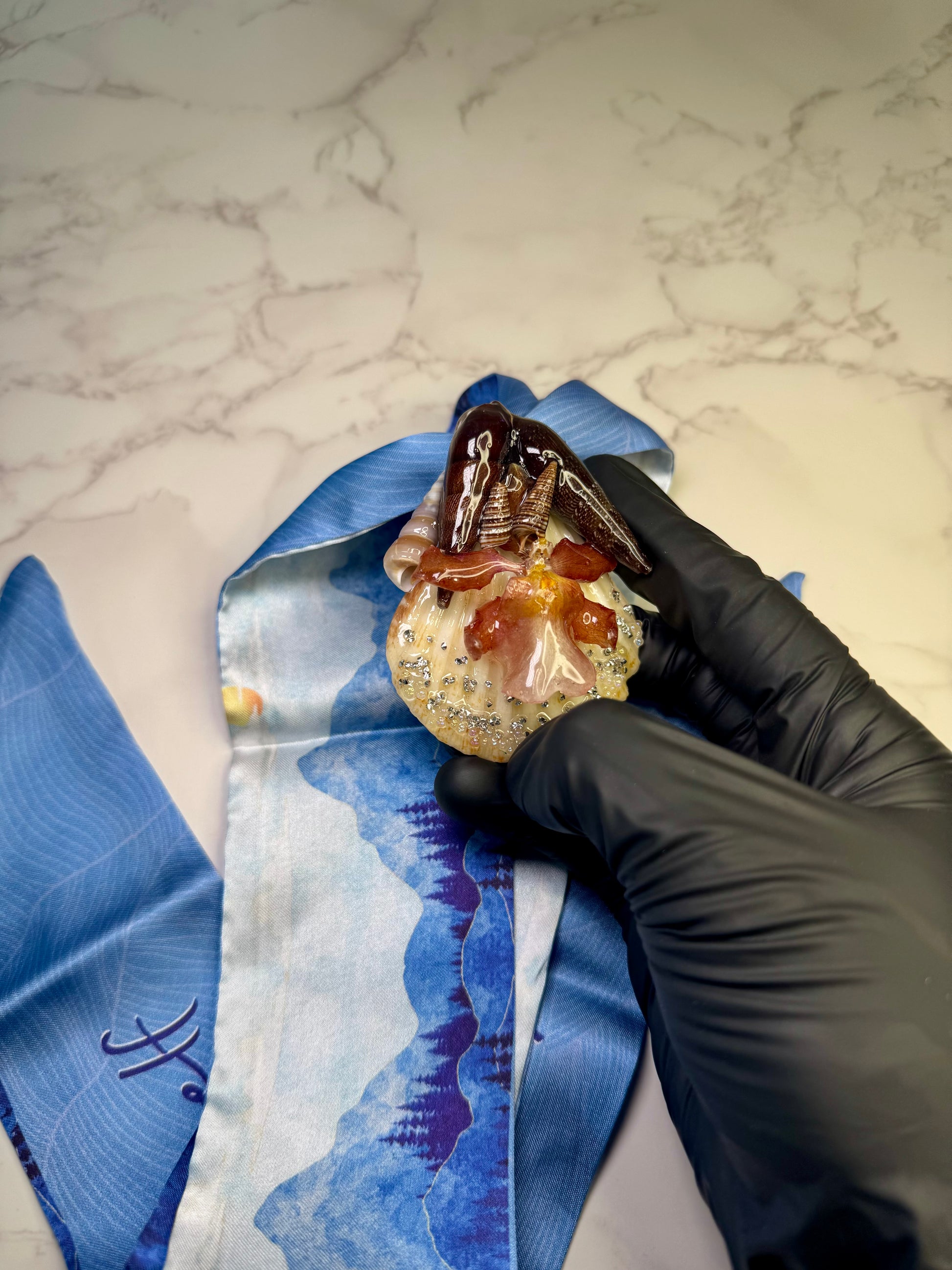 🌸 Materials: natural seashell, mini Cattleya orchid, epoxy resin, fabric accent, UV protection