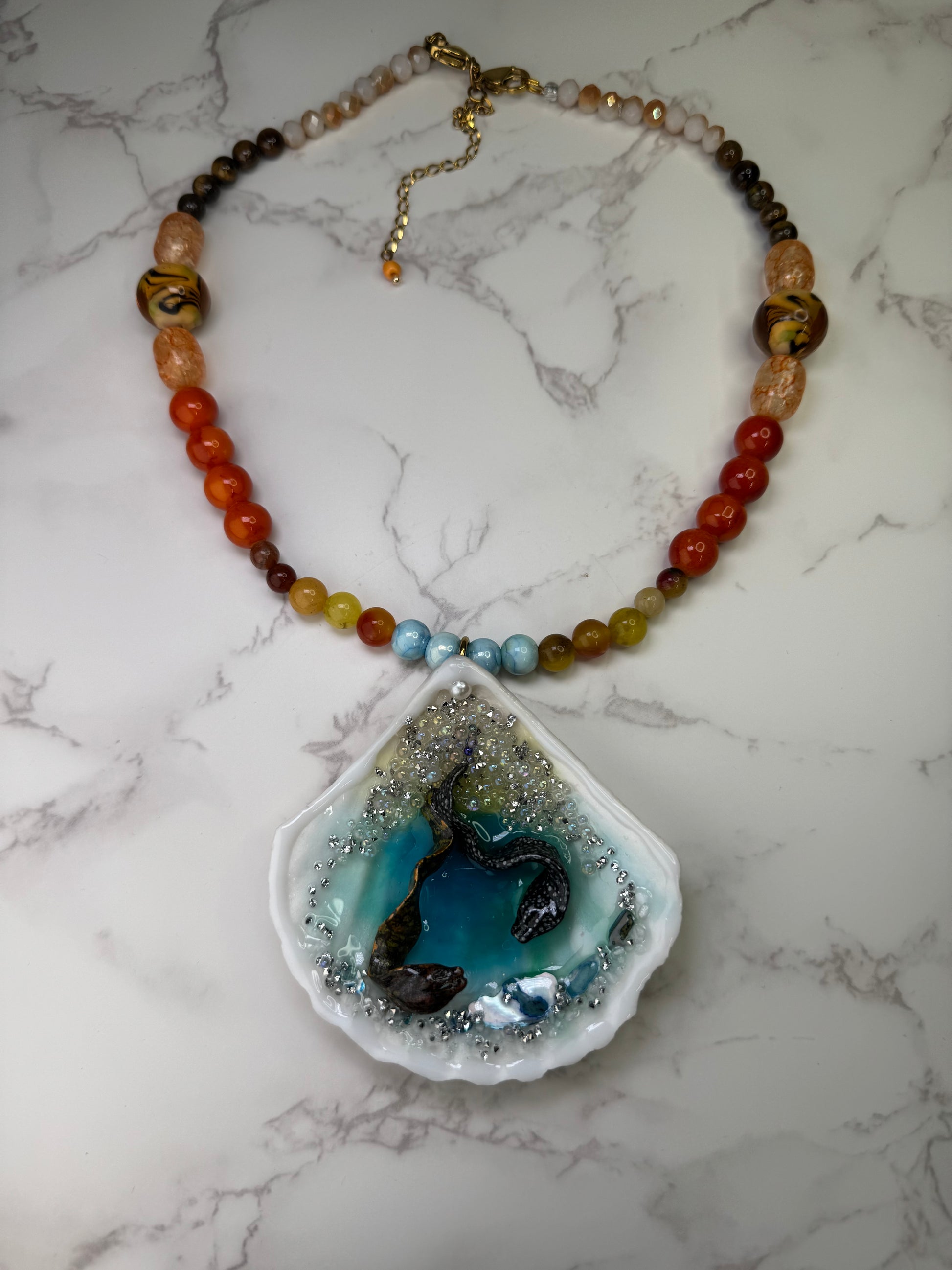 Este collar fue creado especialmente para ti con una concha marina natural y dos anguilas pintadas a mano, encapsuladas en resina epóxica. Todo ha sido trabajado a mano, capturando el movimiento fluido y la elegancia del océano profundo.