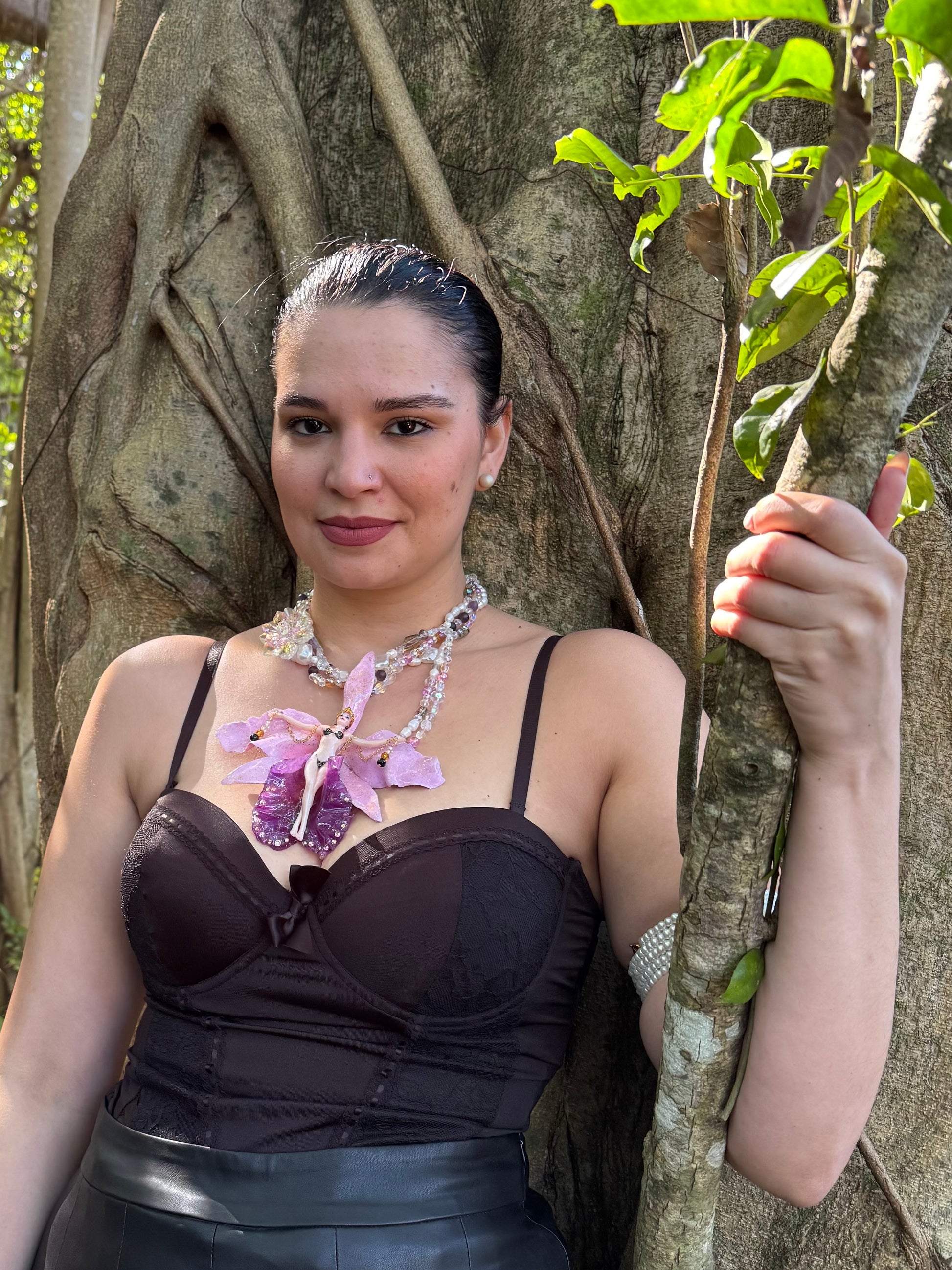 Este collar fue creado especialmente para ti, con una flor de orquídea Cattleya en tonos rosados y púrpuras que alberga en su centro una figura femenina con bikini negro y corona amarilla, adornada con un collar de cuentas y cristales en diseño radiante, que simboliza autoridad, intuición y expresión femenina.